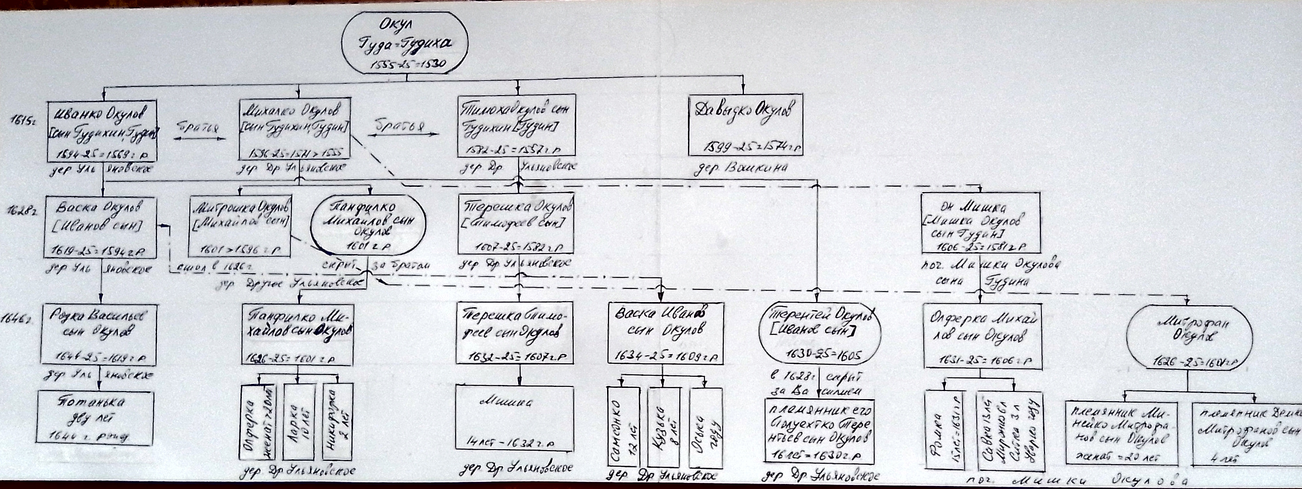 Данные предоставлены Окуловым Олегом Олеговичем. Им же они взяты из писцовых и переписных книг. Данных оказалось очень много — род очень многочисленный, что говорит о его появлении на Вятке, по крайней мере, одним поколением раньше, и это < 1600 г. Опущен Давыд Окулов из дер. Вошкина и его потомки, так как его родство, доказывается проживанием его сыновей в родовых деревнях Окуловых-Гудиных, но не имеет ключевого значения в конечном результате. [На схеме указан только прямоугольник с записью Давыдко Окулов и расчет даты. Остальное опущено.] Опущены Олешка Окулов и его сыновья из починка Митьки Еремеева (Олешки Окулова). Данные мероприятия позволили уменьшить объем схемы в два раза, что позволяют сконцентрировать внимание на основных моментах, имеющих принципиальное значение для анализа родства и восстановления родоначальника данного рода. "Графическая схема анализа родственных связей" делает эти доказательство более наглядными, а правила ее построения особым инструментом.