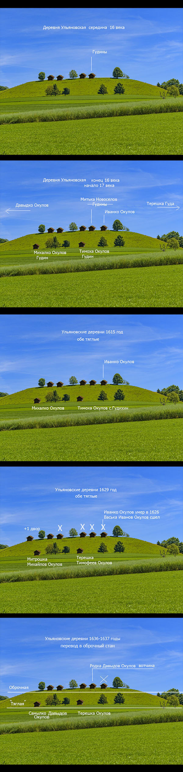 п.с. : Вполне вероятно, что Другую Ульяновскую жители в лице наших Окуловых тоже пытались перевести всю в оброчную, для этого и ее бросили между 1629 и 1636 годами, только это осталось за рамками переписей, этот номер удался не до конца, деревню после льготы вернули из оброчной обратно в тяглую , такие случаи хорошо известны, т.к. правительство было заинтересовано в сохранении тягла.