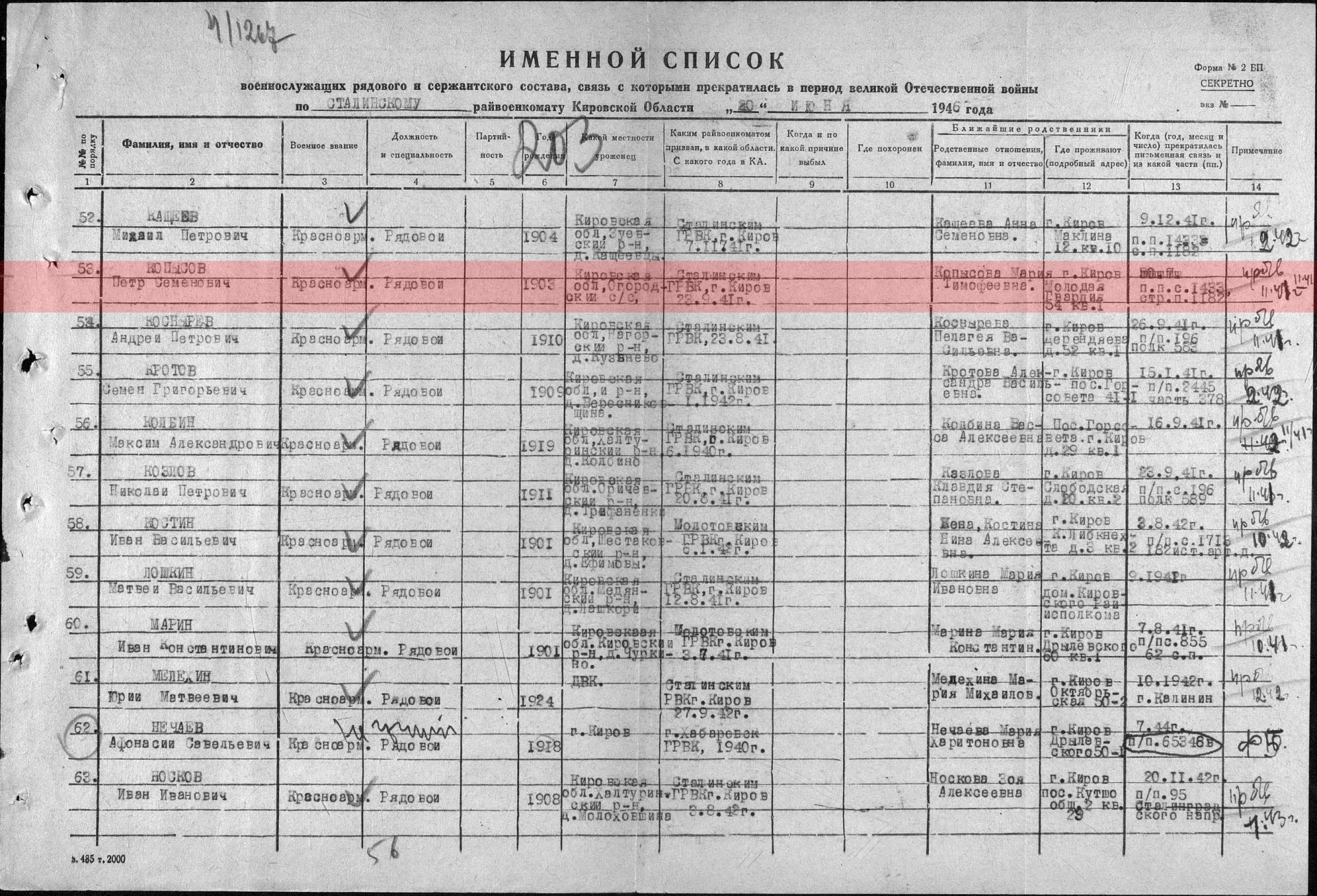| 4315331005 | КОПЫСОВ Петр Семенович | 1903 г. р., урож. Богородского с/с Богородского р-на, красноармеец, мобилизован Сталинским РВК. Пропал без вести в ноябре 1941 г. | Кировская область, Киров |