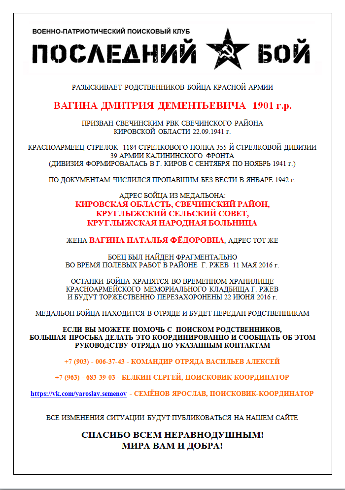 22 июня на мемориальном воинском кладбище г. Ржев состоится торжественная церемония перезахоронения останков солдат, найденных поисковыми отрядами в Ржевском районе за прошедший год. В числе полутора тысяч бойцов будет и Вагин Дмитрий Дементьевич, павший геройски на подступах к Ржеву.