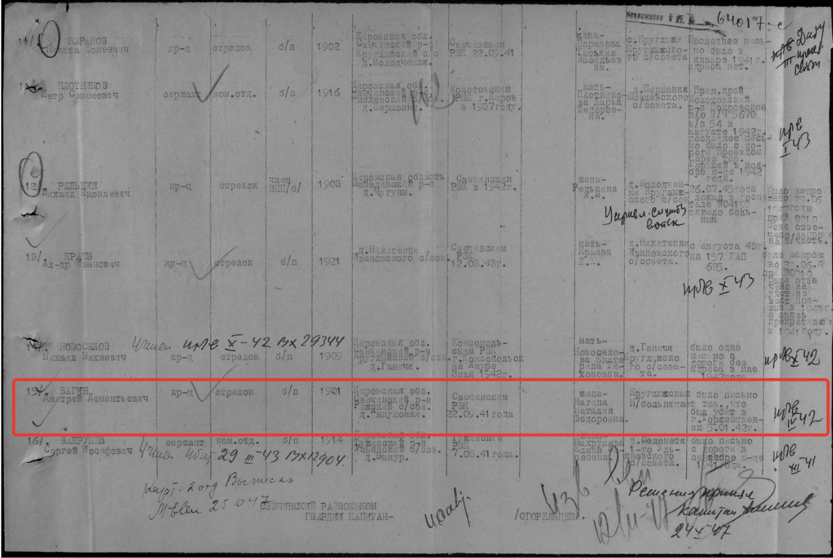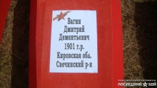 | 4310681013 | ВАГИН Дмитрий Дементьевич | 1901 г. р., из д. Анкушонки Рижского с/с. Призван в 1941 году. Красноармеец, стрелок. Пропал без вести в апреле 1942 года. | Кировская область, Свечинский район |
