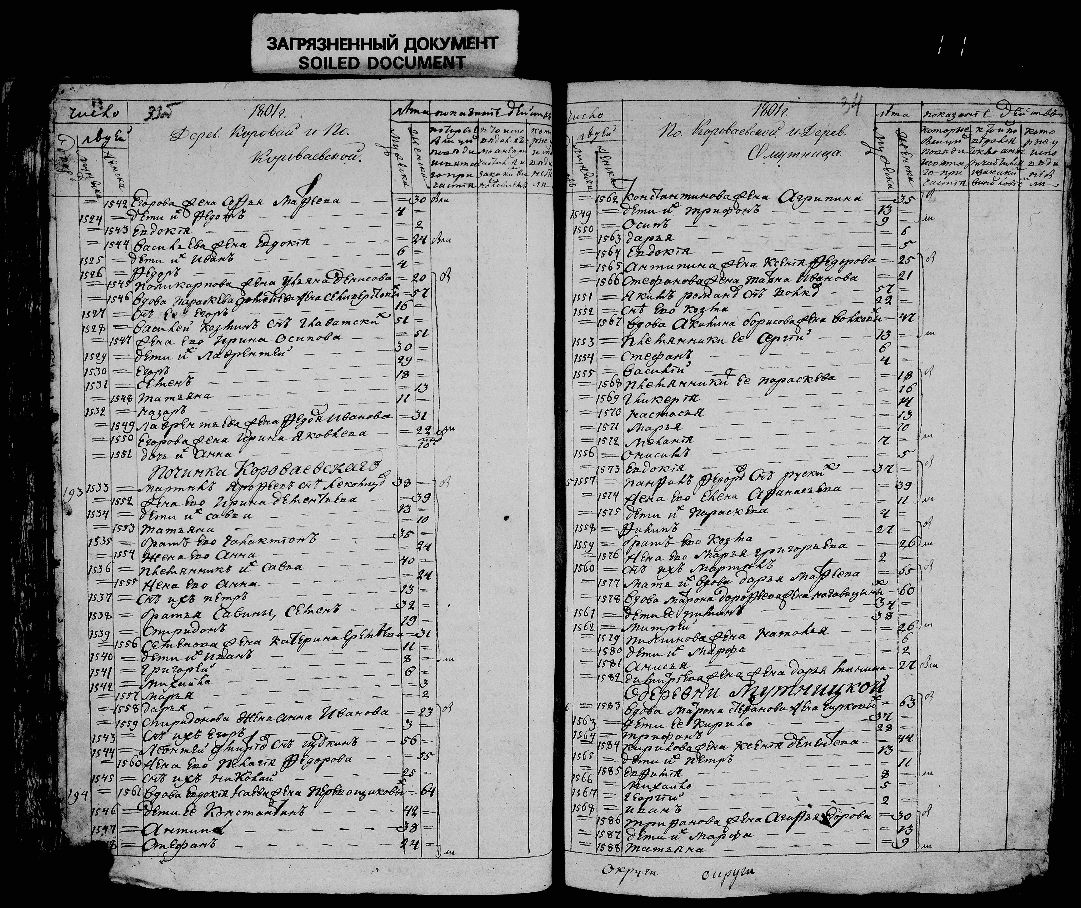 Исповедная роспись за 1801-1807 г.г. также имеется в ф.19, опись 1, дело 13 ЦГАУР. На стр. 32-33об. записи о жителях деревни Короваевской, деревни Коровай и починка Короваевского. Именно "деревня Коровай", видимо, имела также название д. Котомкинская. Такой вывод сделала на основании записи по другому н.п. в РС 1795 г, где жена моего предка указана как "взятая из деревни Котомкинской " и нашла её именно в этой деревне.