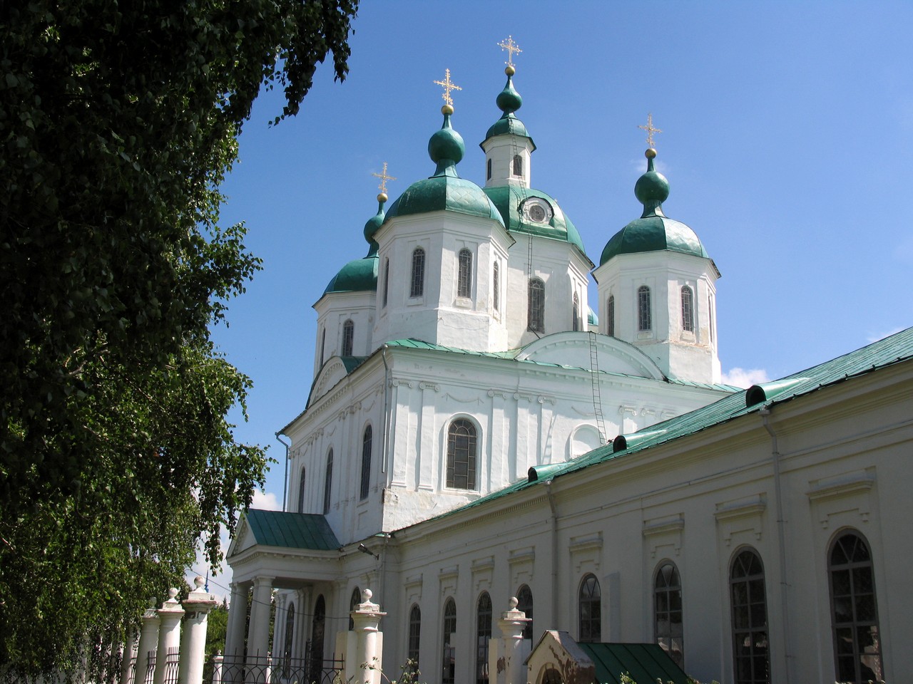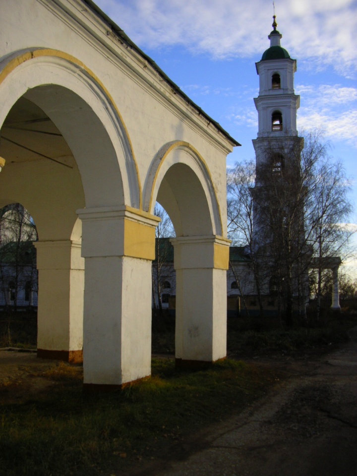 После падения Казанского царства на месте Елабужского Чёртового городища была устроена иноческая обитель в 1614 году. В 1616 году на этом месте было закончено строительство Троицкого монастыря и его церквей, но просуществовал он недолго и в 1764 году был упразднён. Примерно ко времени создания обители относится и основание села Трёхсвятского, так в записках известного князя Курбского упоминается о походе на Каму, совершённом русскими вскоре после покорения Казани царём Иоанном IV Васильевичем Грозным. В книге Большого Чертежа, составленной в первой четверти XVII столетия, Трёхсвятское упоминается так «а ниже реки Ика 40 вёрст на реке Каме город Чертов — Елабуга тож». Существует предположение что после основания села Трёхсвятского и первой Покровской церкви царём Иваном Васильевичем, по приказанию коего и была заложена Покровская церковь, был пожалован в Покровскую церковь образ Трёх Святителей, отчего Елабуга и стала называться селом Трёхсвятским. Образ Трёх Святителей до сих пор хранится в Покровской церкви города Елабуги, живопись его нисколько не пострадала и принадлежит к древнейшему греческому стилю. Со времени пожалования иконы Трёх Святителей царём Иоанном IV в Покровскую церковь село Трёхсвятское называлось «Трёхсвятское, Елабуга тож».