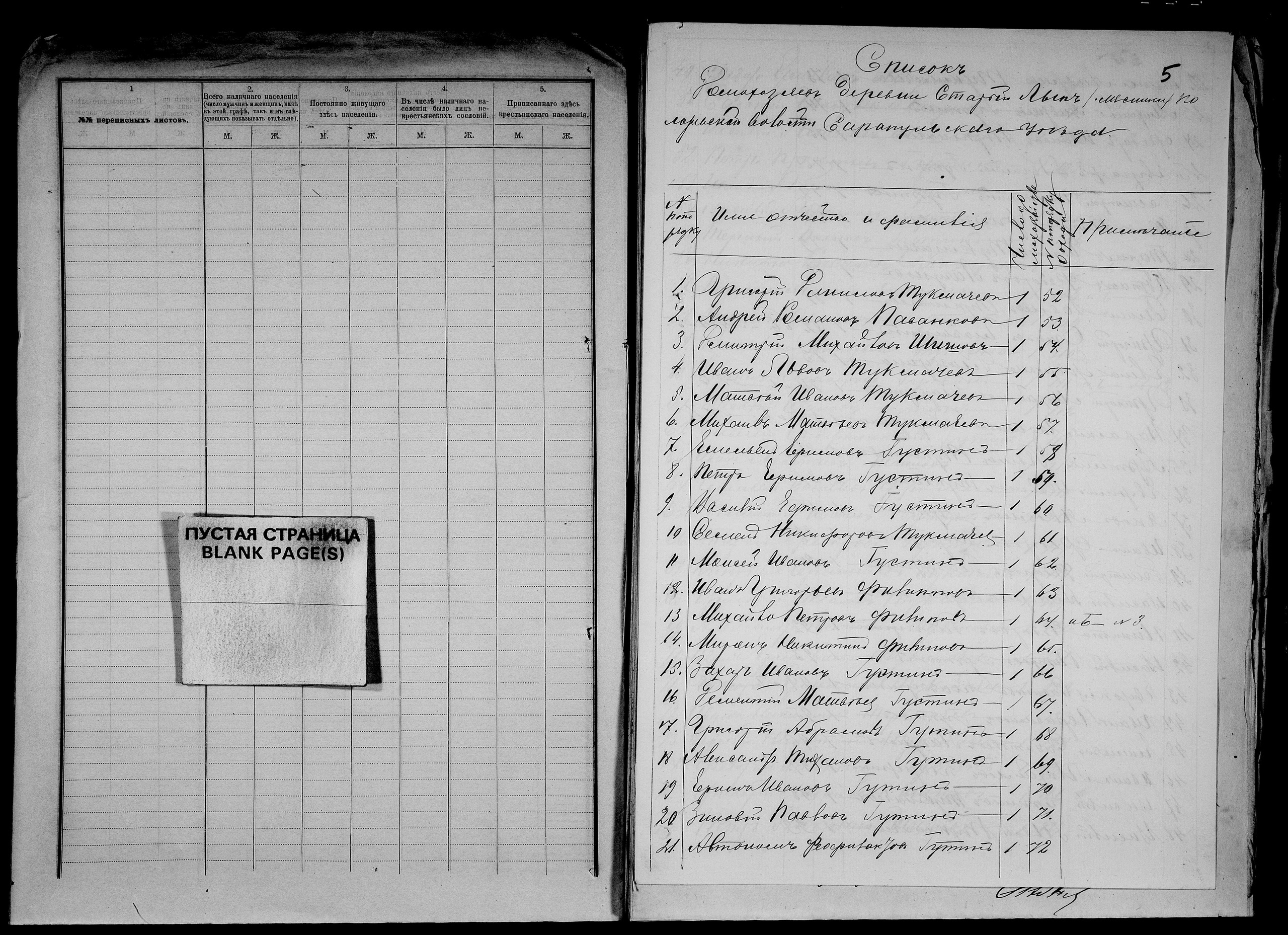 Собою перешедшей ис показанной деревни Смородовской тояж волости вновь росчисной починок Русаковской и там в наличности показаны будут Парфен Осипов сын Питиримов 18/-/-, брат ево Тимофей 16/-/-, у Парфена сын Филип 2/умре в 749м году.