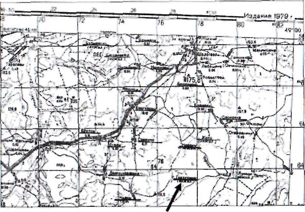 Карта части территории Шалеговского сельского совета. 1979 год. Нежилая деревня Гладухины указана стрелкой