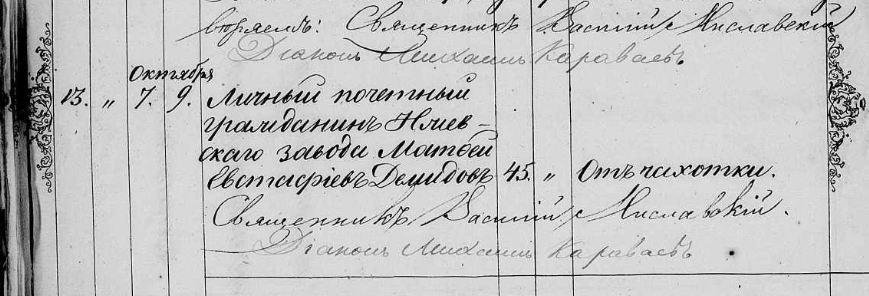 Умер личный почетный гражданин Ижевскаго завода Матфей Евстафиев Демидов, 45 лет, от чахотки