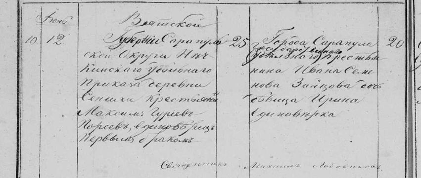 Жених - Вятской губернии Сарапульской округи Нечкинскаго удельнаго приказа деревни Сенихи крестьянин Максим Гуриев Порсев, единоверец, первым браком, 25 лет
