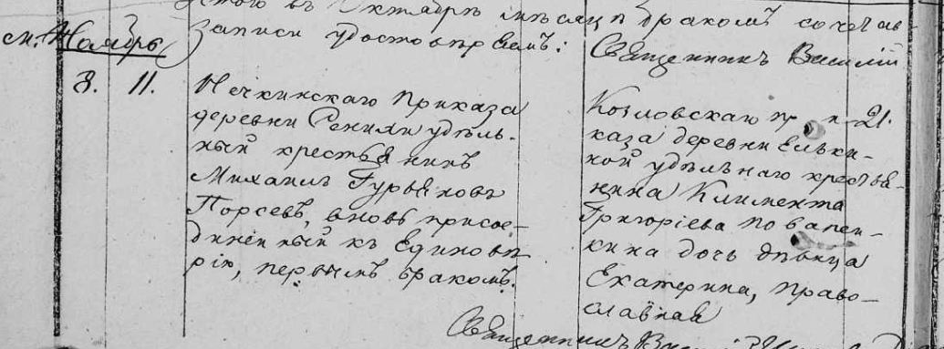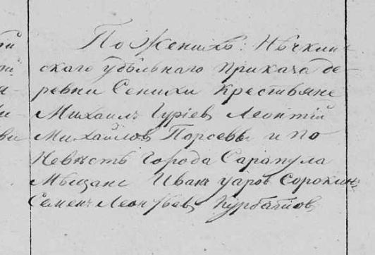 Жених - Нечкинскаго приказа деревни Сенихи удельный крестьянин Михаил Гурьянов Порсев, вновь присоединенный к единоверию, первым браком, (без указания возраста)