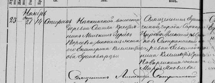 Восприемница: той же деревни Александра Михайлова Порсева (это не дочь Михаила Гурьянова, просто совпадение отчества)