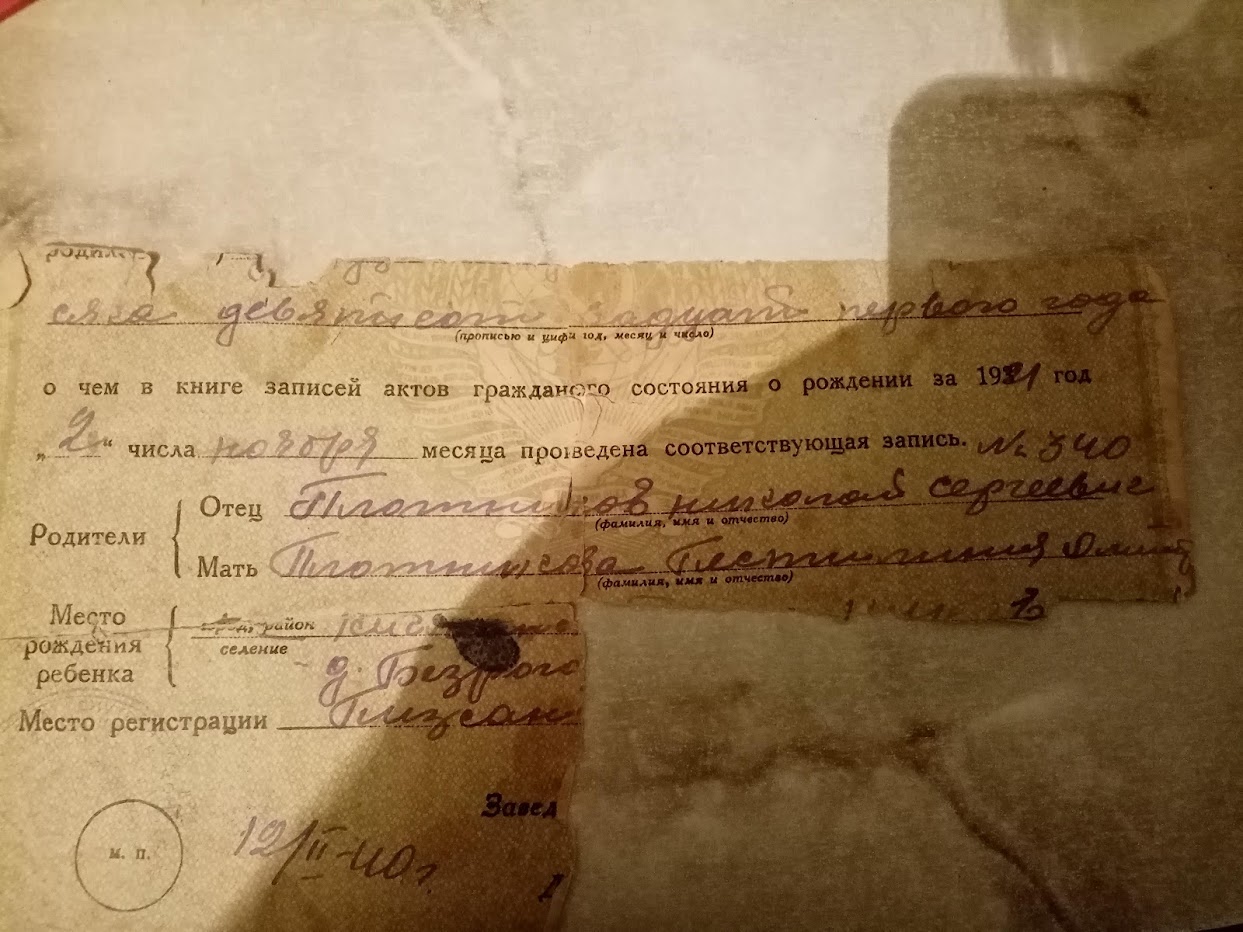 Ищу родственников или любую информацию по бабушке/дедушке. Бабушка- Мамаева Татьяна Николаевна, урожденная Плотникова. Дед - Мамаев Федор Кузьмич. Знаю, что до войны они жили в Кировской области. Дед был призван с Кировской обл., Кичминский р-н, Мамаевский с/с, д. Б. Мамаевка. После ранения был демобилизован и отправлен в тыл в Новосибирскую область. Осталась часть метрики бабушки