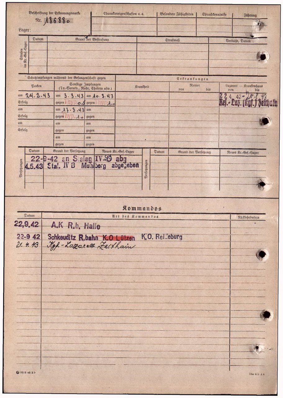 | Умер | 20.08.1943 | Kgf. Res. Lazarett Zeithain (Цайтхайн, Германия) | умер в немецком плену, в лазарете Цайтхайн |
