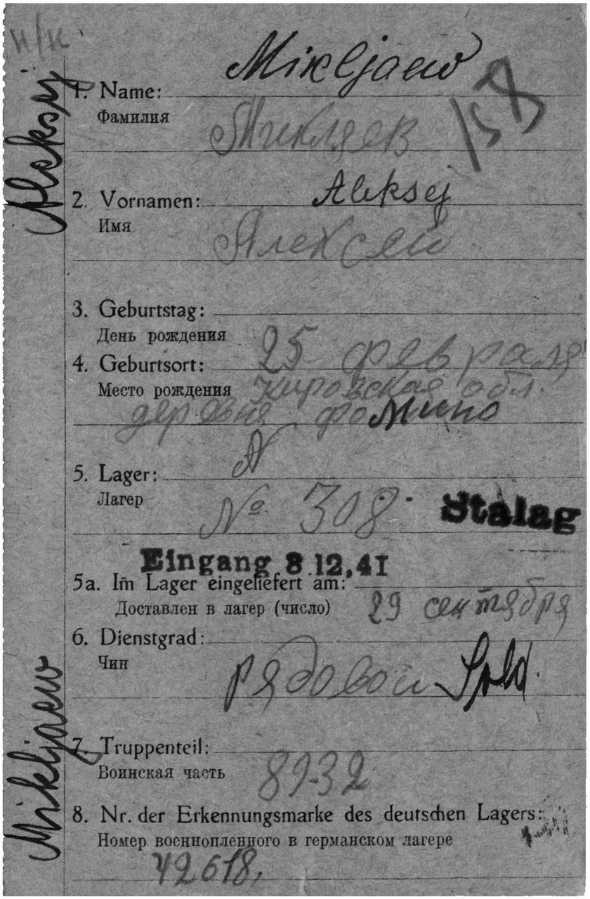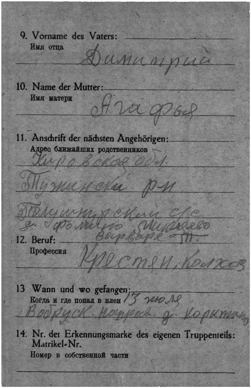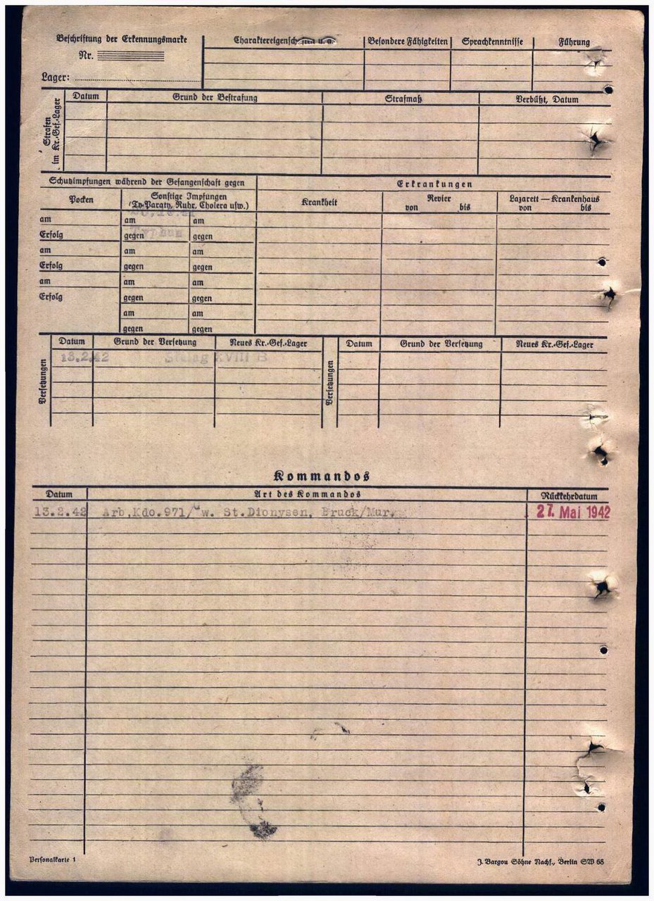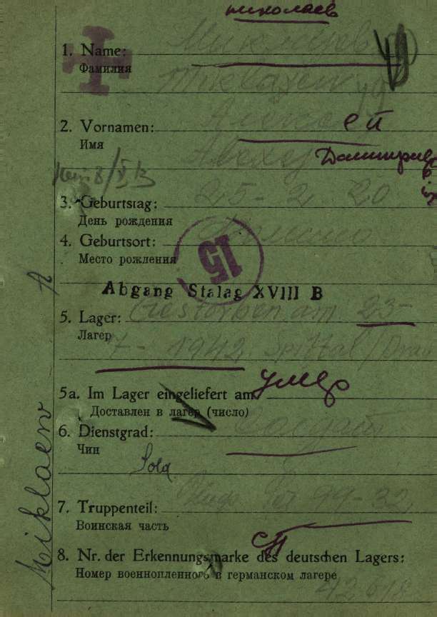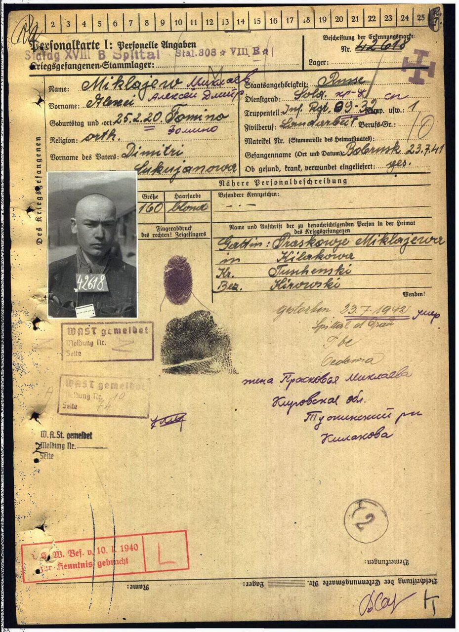 | Умер | 23.07.1942 | Stalag XVIII B Spittal an der Drau (Шпитталь-ан-дер-Драу, Австрия) | умер в немецком плену, в лагере военнопленных Шпитталь-ан-дер-Драу |