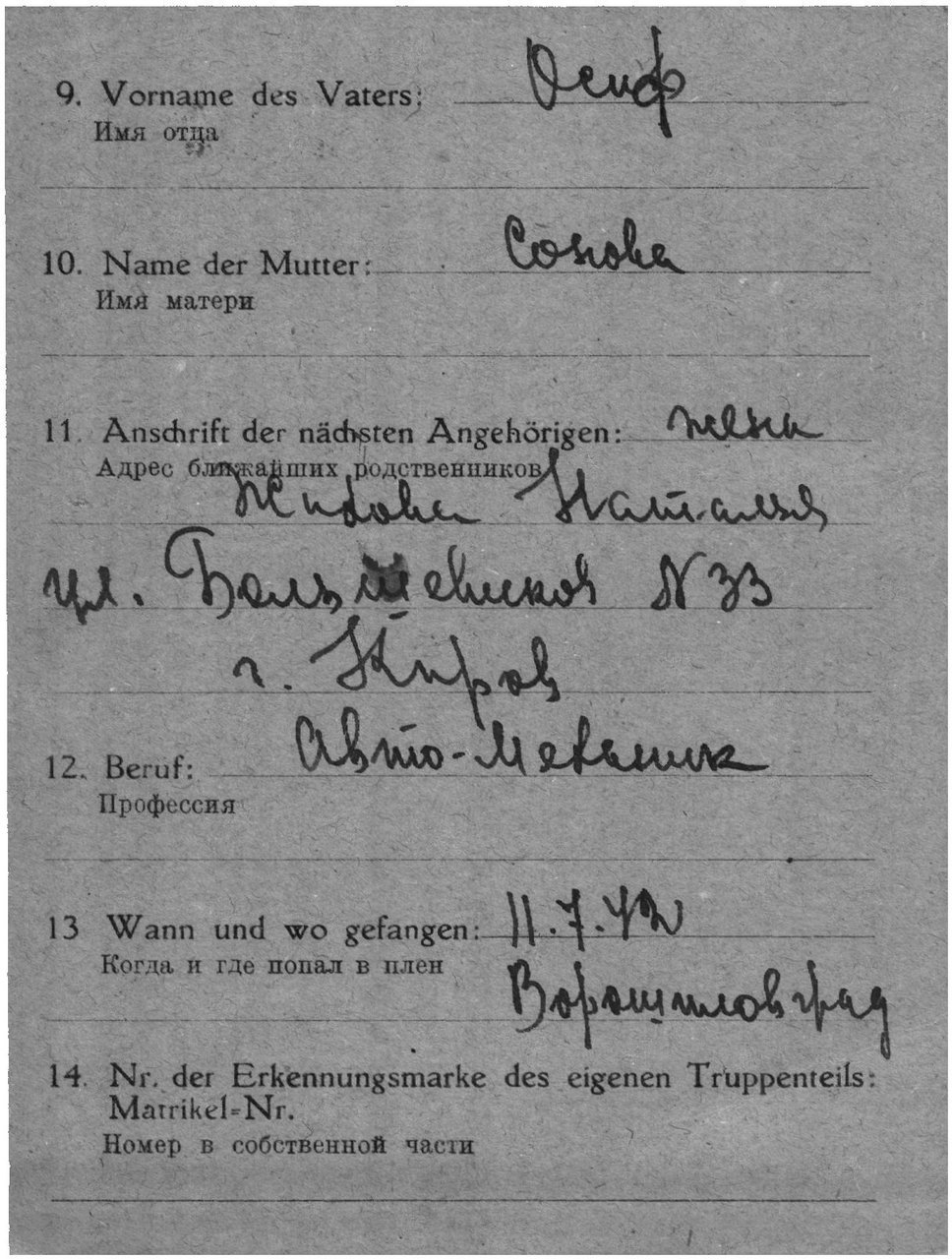 | Умер | 18.08.1943 | Kgf. Res. Lazarett Zeithain (Цайтхайн, Германия) | умер в немецком плену, в лазарете Цайтхайн |