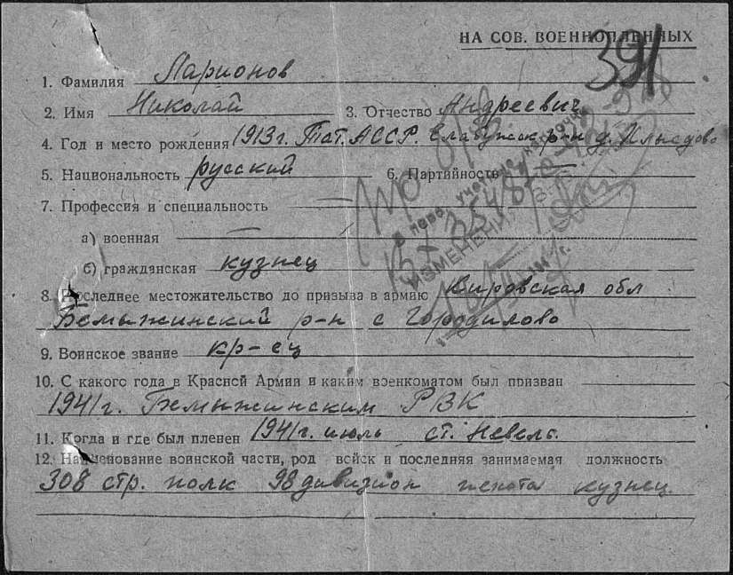 | Попал в плен | Июль 1941 | ст. Невель | www.obd-memorial.ru |