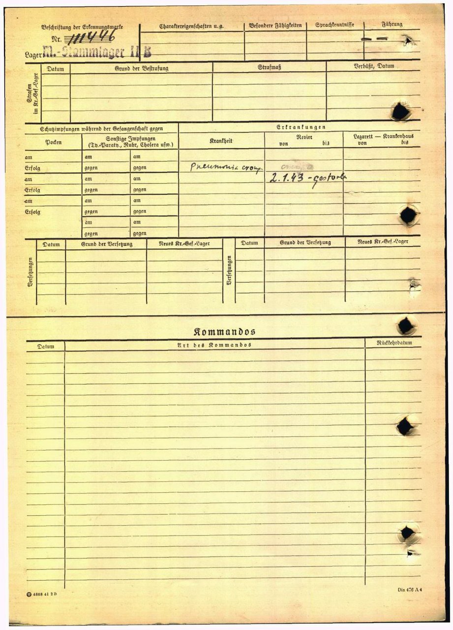 | Умер | 02.01.1943 | Stalag II B Hammerstein (Чарне, Польша) | Умер в немецком плену, в лагере военнопленных Хаммерштайн. |