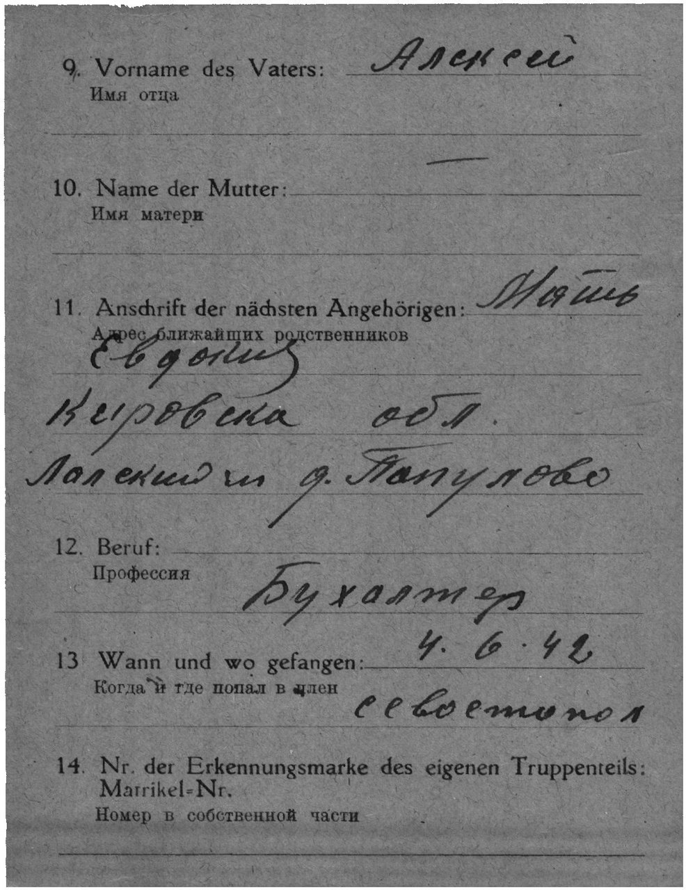 | Попал в плен | 04.06.1942 | Севастополь | www.obd-memorial.ru |