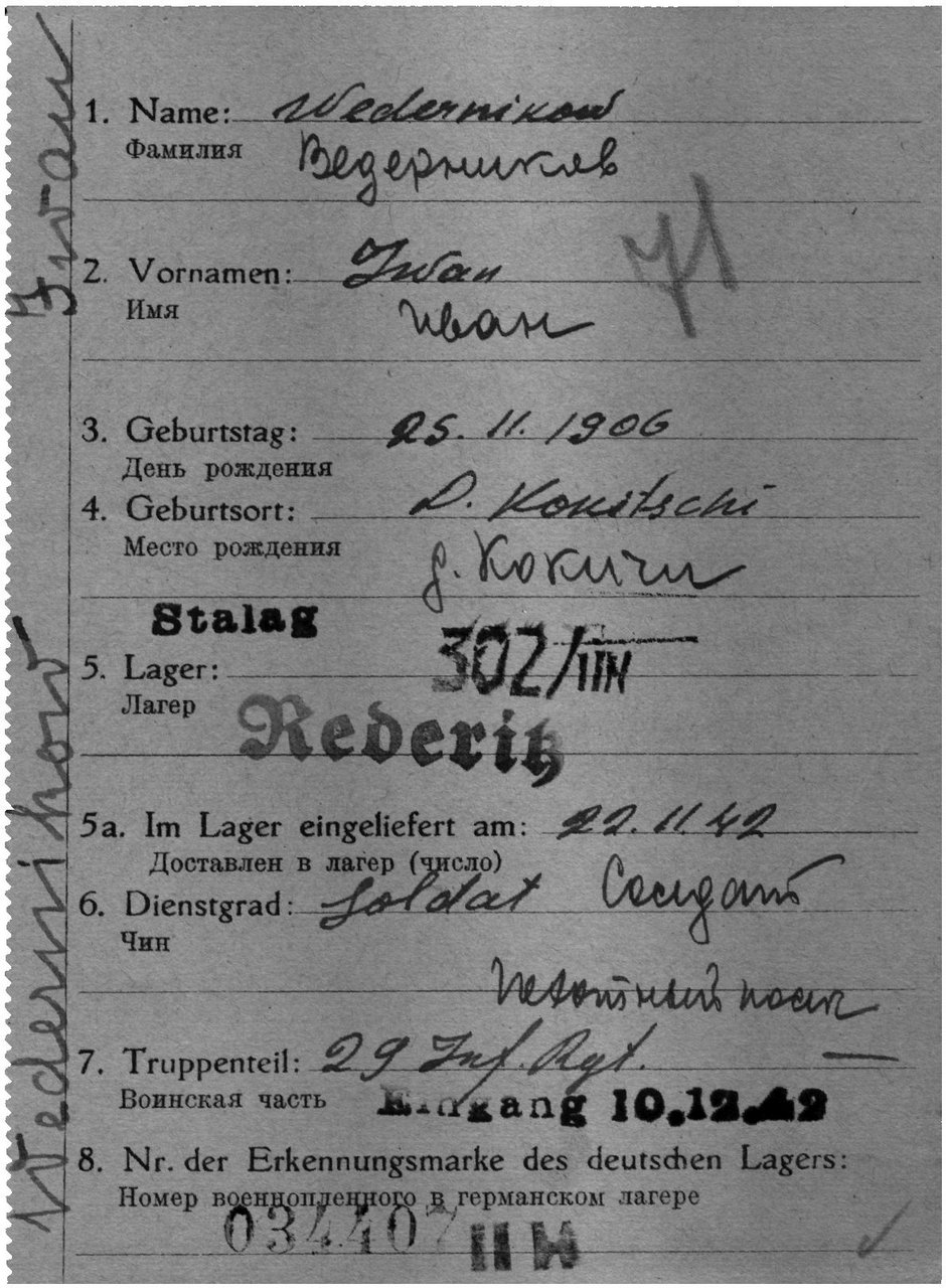 | Умер | 14.01.1943 | Stalag II H (302) Gross Born-Rederitz (Борне-Сулиново/Надажице, Польша) | Умер в немецком плену, в лагере военнопленных Гросс Борн-Редериц. |