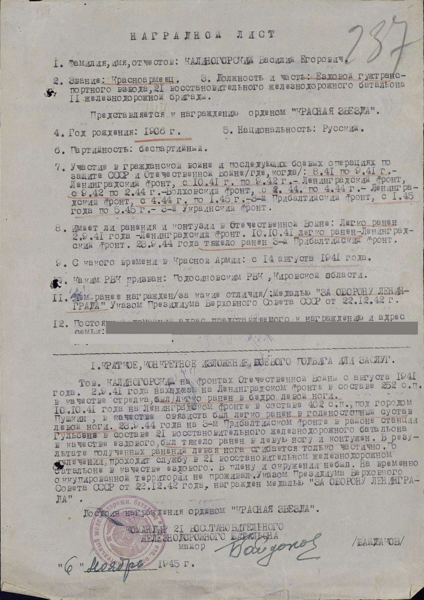 | Награждён: награды | 22.12.1942 | Медаль "За оборону Ленинграда" | |