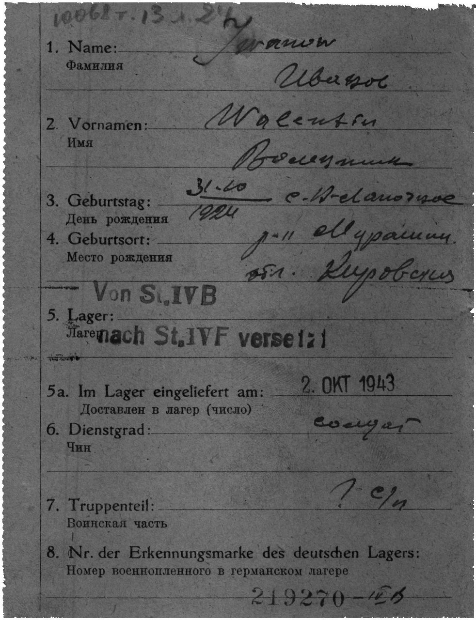 | Попал в плен | 27.10.1942 | Сталинград | www.obd-memorial.ru |