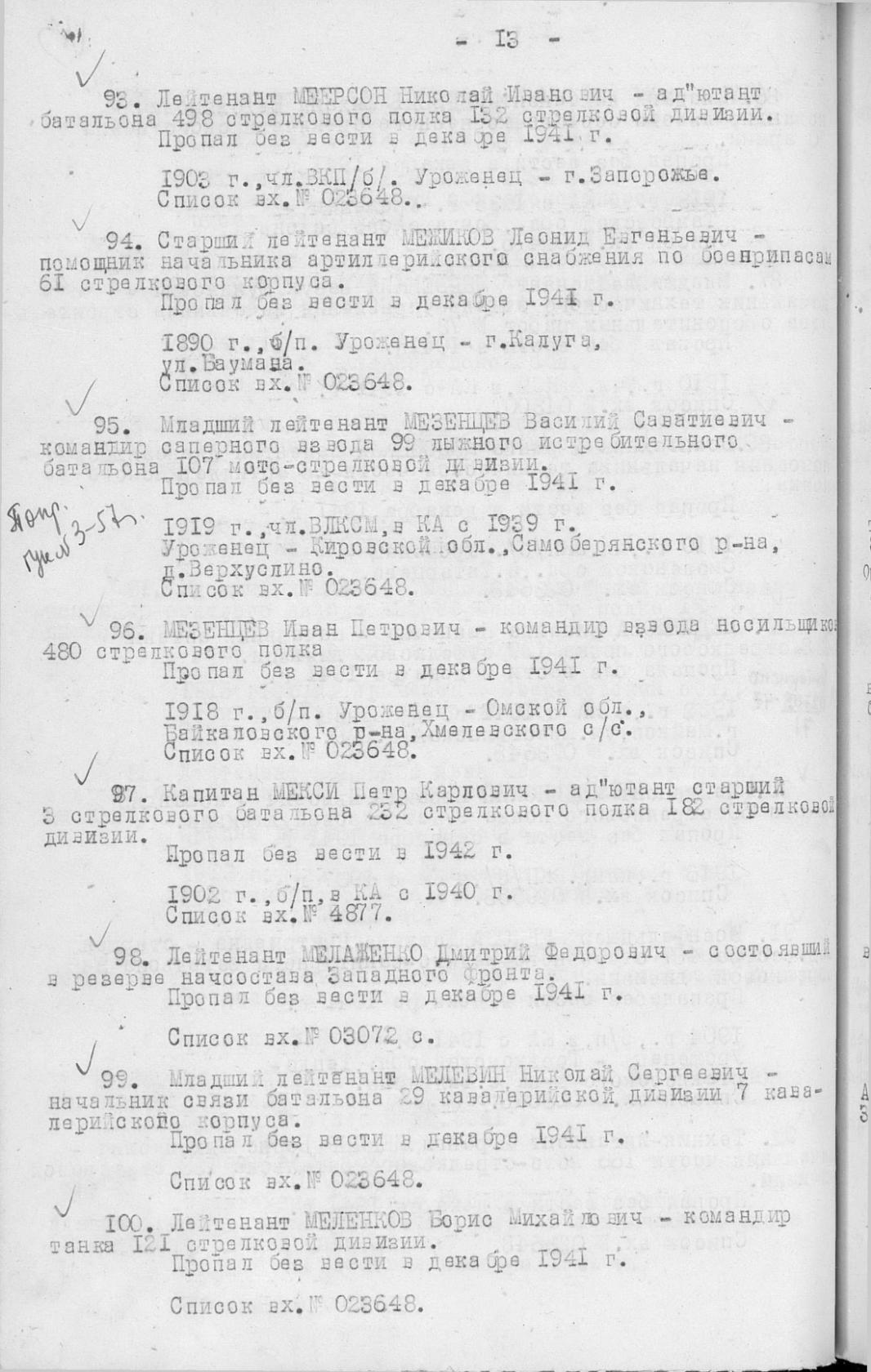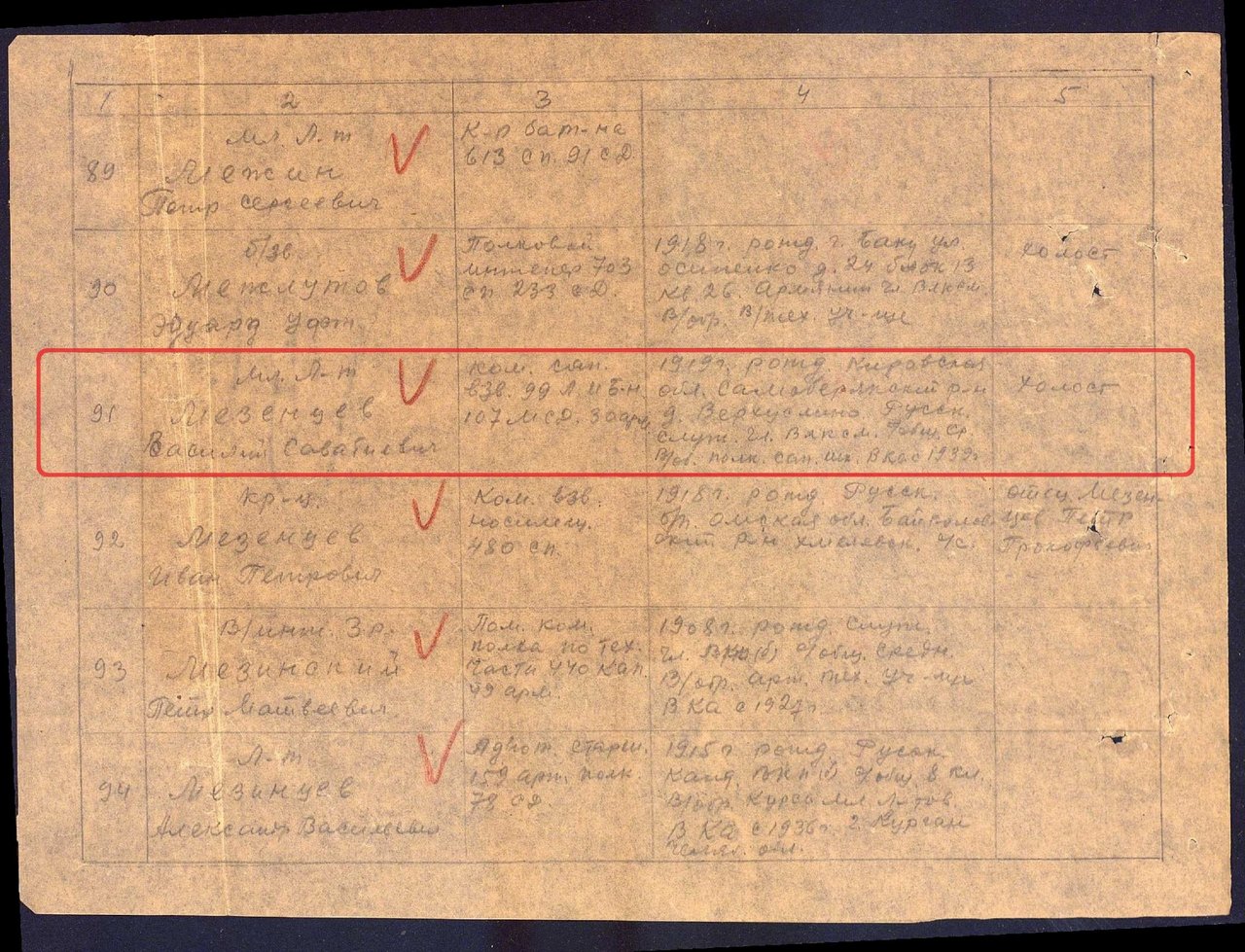 | 4314421019 | МЕЗЕНЦЕВ Василий Савватеевич | 1919 г. р., из д. Верхоуслино Верхоуслинского с/с, мл. лейтенант, ком. взвода, 29 б-н, 30 армия, в октябре 1941 года пропал без вести. | Кировская область, Яранский район |