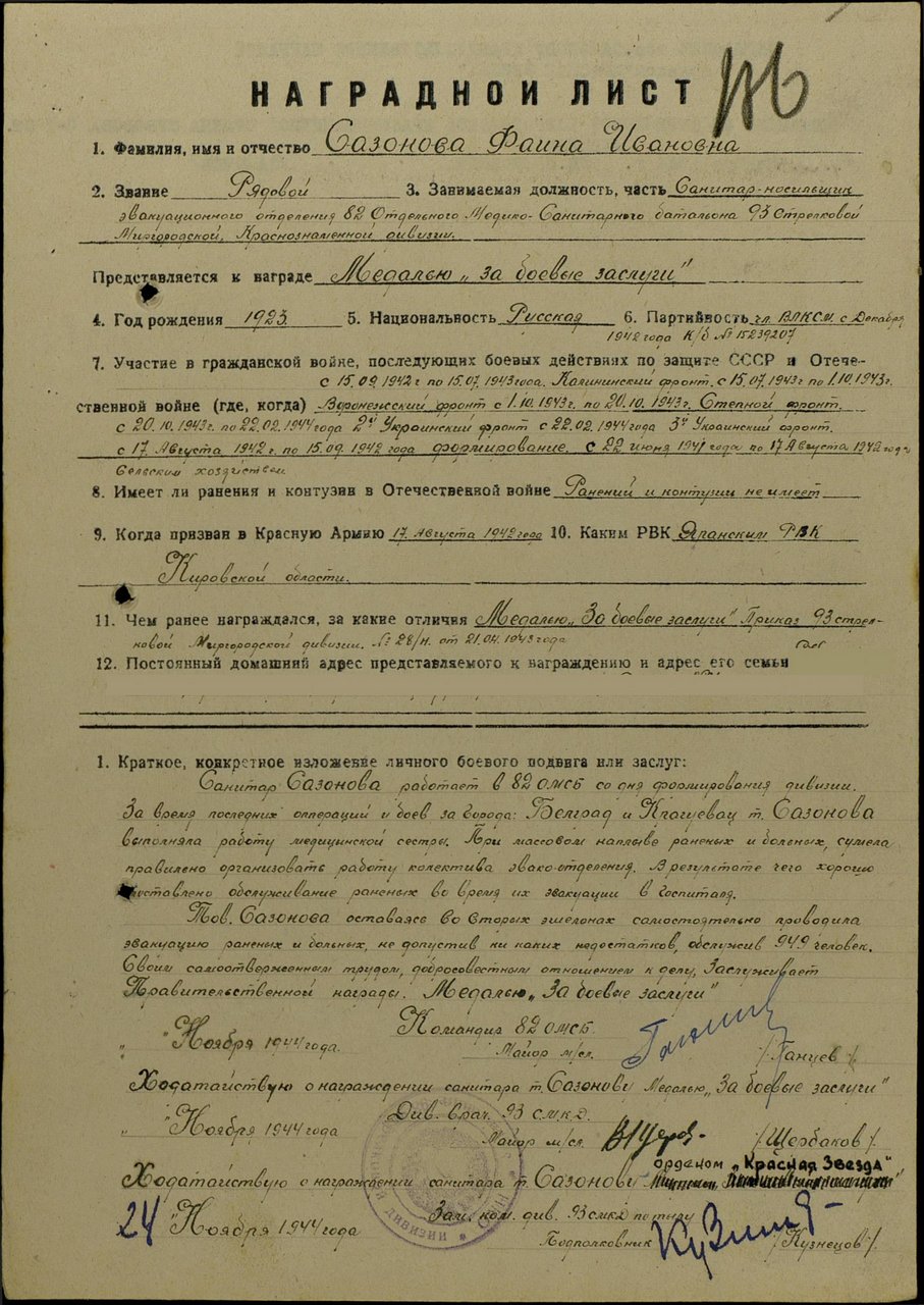 документах, Сазонова Фаина Ивановна награждена медалью "За боевые заслуги" и орденом "Красной Звезды", медалями "За освобождение Белграда", "За взятие Будапешта",