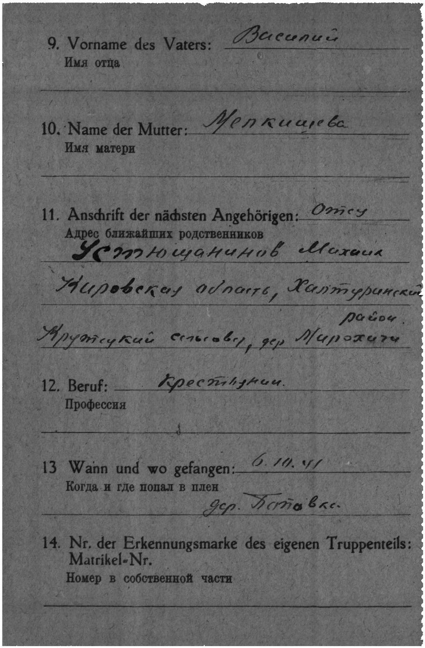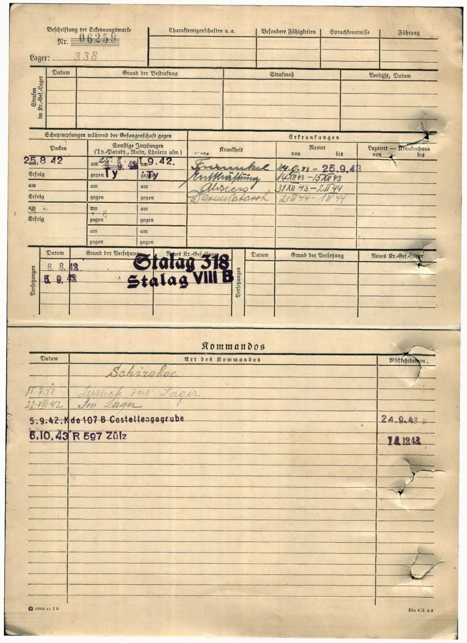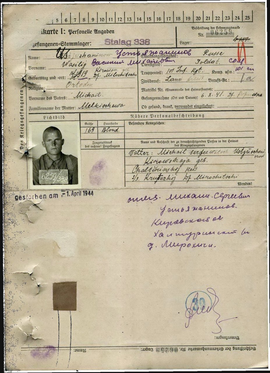 | Умер | 01.04.1944 | Stalag 344 Lamsdorf (Ламбиновице, Польша) | Умер в немецком плену, в лагере военнопленных Ламсдорф. |