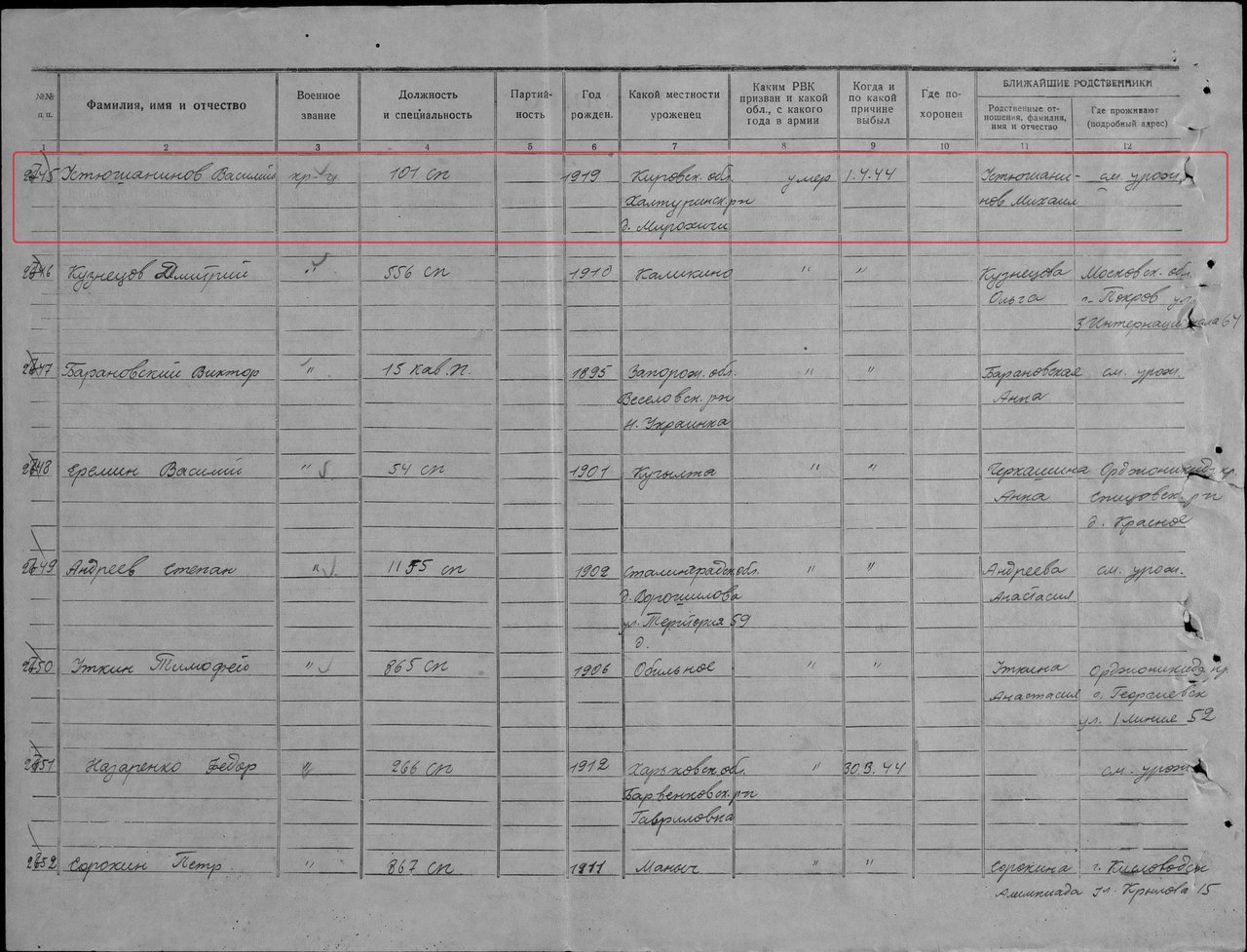 | Родился | 16.08.1919 | деревня Мирохичи (Гремячевский) (Орловский район, Кировская область) - ныне не существует | д. Мирохичи, Крутецкий с/с, Халтуринский район, Кировская область, www.obd-memorial.ru |