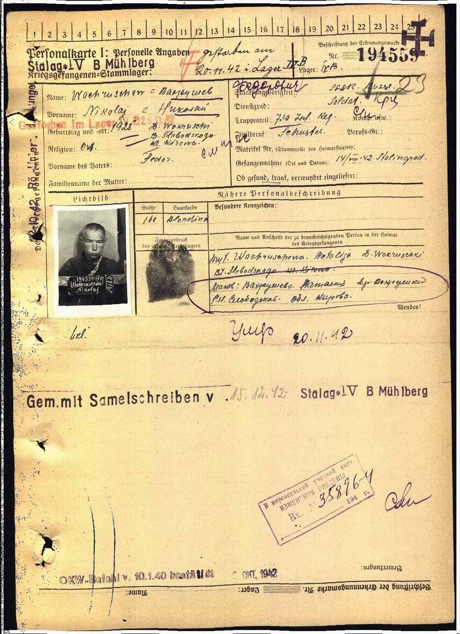 | Умер | 20.11.1942 | Stalag IV B Mühlberg (Мюльберг на Эльбе, Германия) | Умер в немецком плену, в лагере военнопленных Мюльберг. |