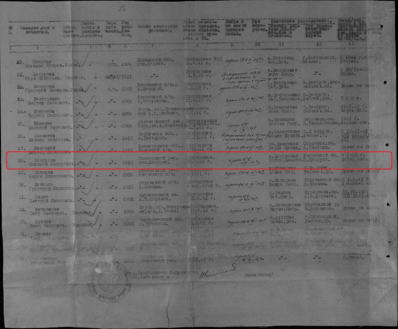 | Родился | 1923 или 1925 | деревня Вахруши (Трофимовская) (Слободской район, Кировская область) - существующий н.п. | д. Вахруши, Ленинский с/с, Слободской район, Кировская область, www.obd-memorial.ru |