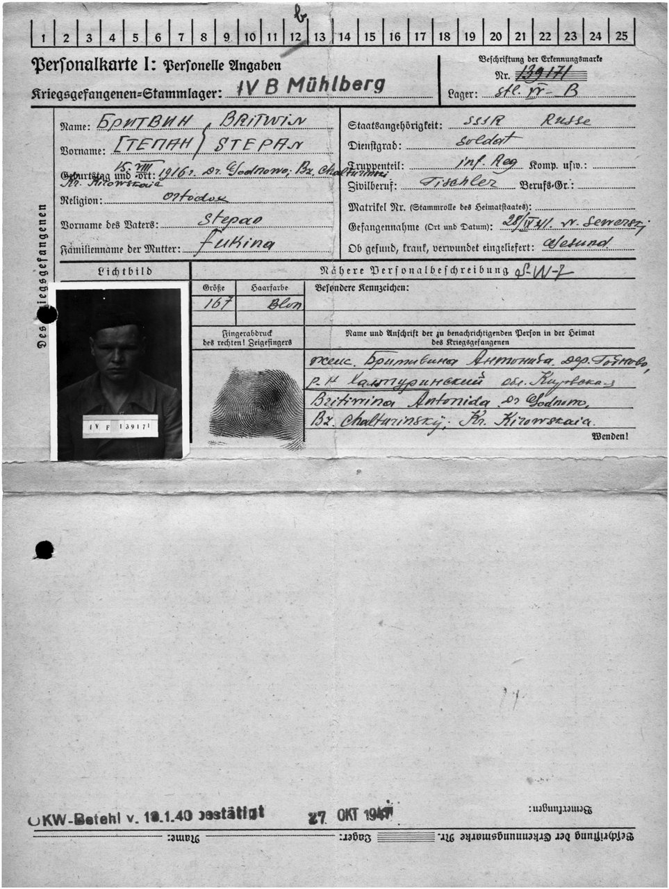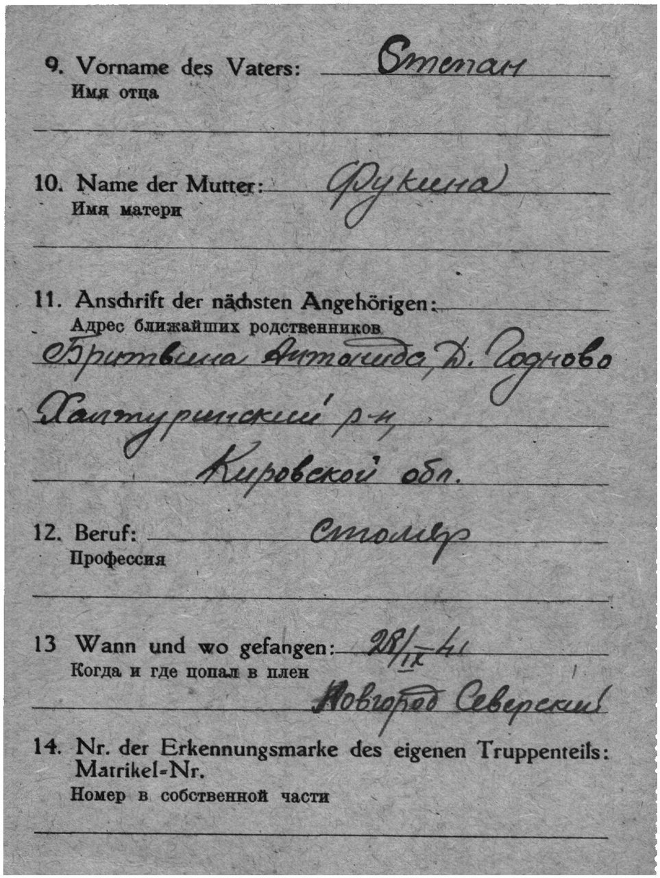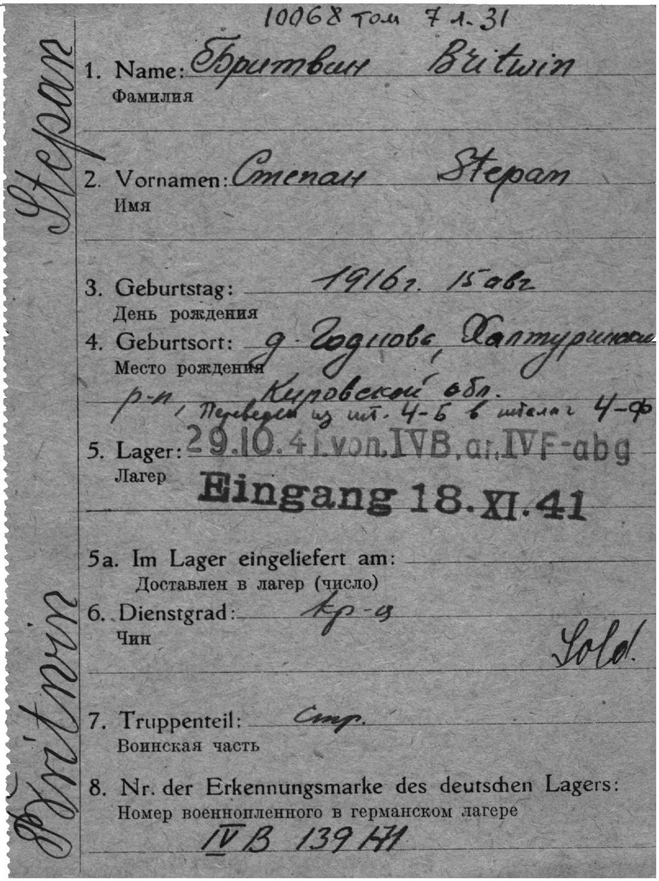 Карта военнопленного, лицевая сторона https://www.obd-memorial.ru/html/info.htm?id=82719713&page=3Карта военнопленного, обратная сторона https://www.obd-memorial.ru/html/info.htm?id=82719713&page=4Зелёная карта, лицевая сторона https://www.obd-memorial.ru/html/info.htm?id=82719713&page=1Зелёная карта, обратная сторона https://www.obd-memorial.ru/html/info.htm?id=82719713&page=2