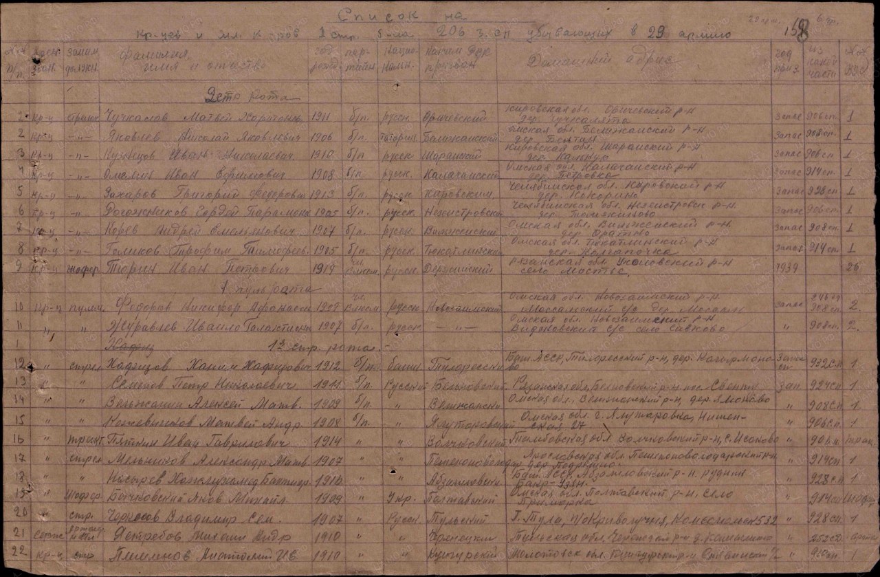 (Источники информации: Алфавитная книга призванных по мобилизации в период Великой Отечественной войны Оричевским РВК Кировской области на «Х, Ц, Ч», листы 38 об, 39, № 54; Похозяйственная книга за 1943 — 1945 г.г. колхоз «Свободный Труд»; ЦАМО. Фонд: 8502. Опись: 267372. Дело: 8; Филиал ЦАМО (Архив военно-медицинских документов). Картотека: Картотека общего учета. Фонд: Картотека ранений. Опись: Картотека общего учета. Номер ящика: 060-21)