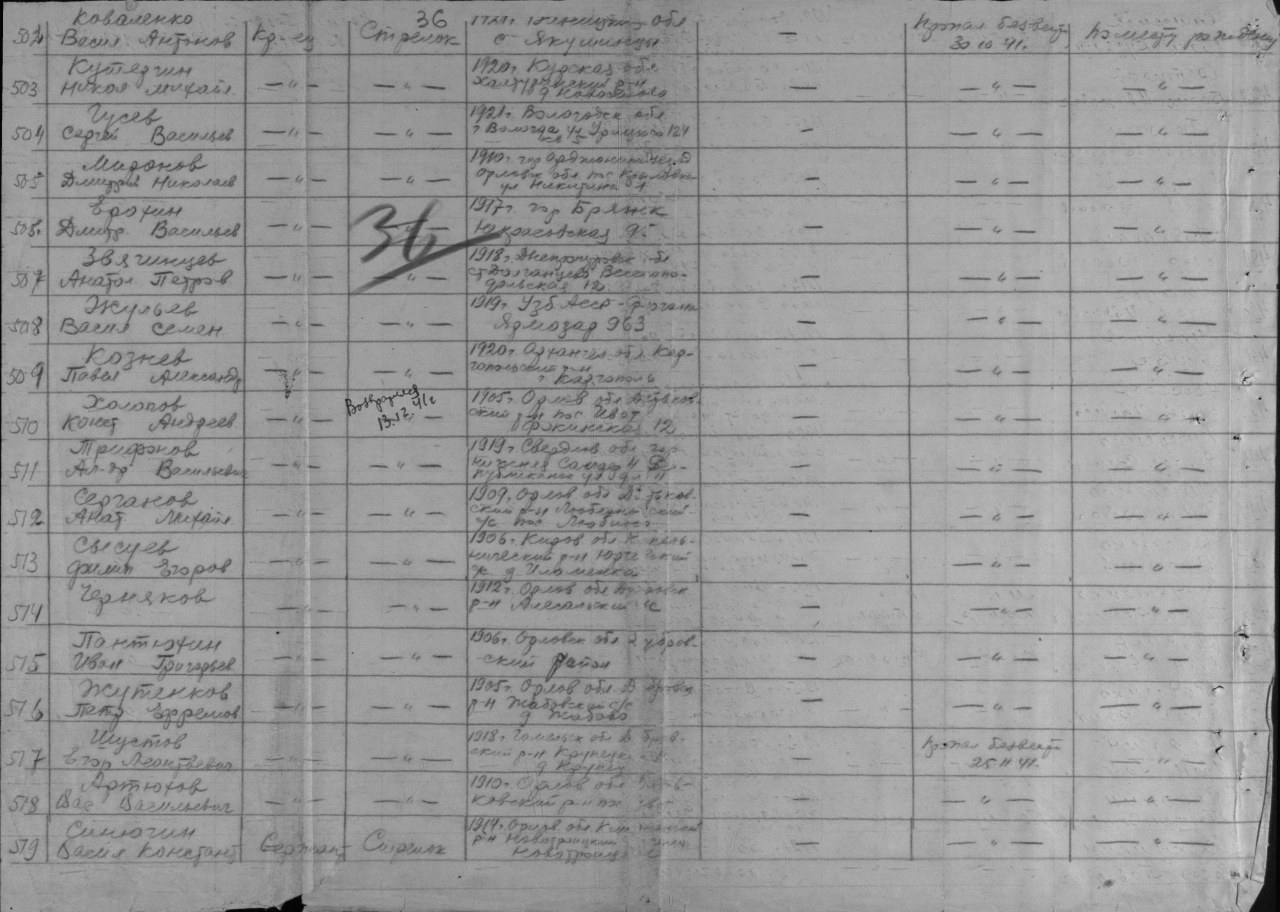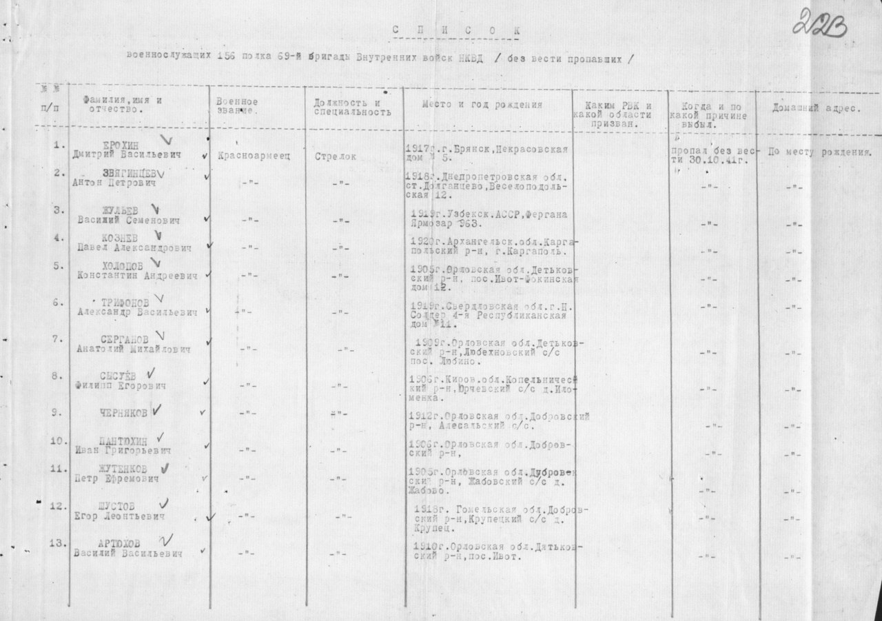 | Пропал без вести | 30.10.1941 | г. Тула южное шоссе | красноармеец 156 полка НКВД,пропал без вести при обороне южных подступов к городу Тула |