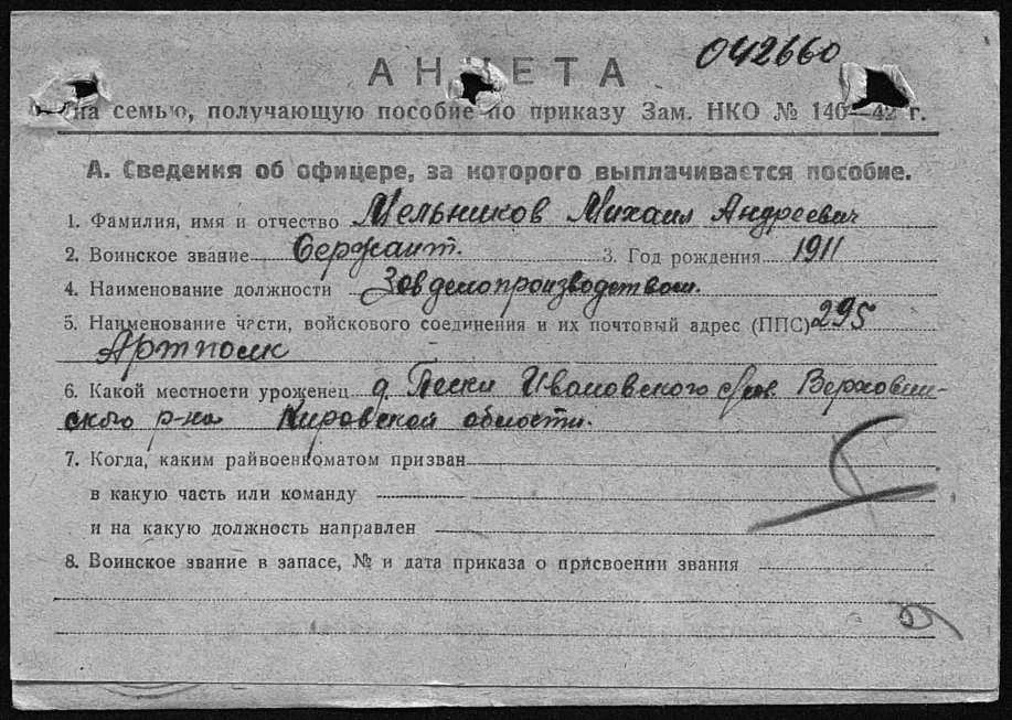 Мельников Михаил Андреевич, 1911 г.р., уроженец д. Пески Ивановского с/с Верховинского района, призван в РККА в 1939 г. До призыва работал директором Ивановской средней школы Верховинского района. Сержант, зав. делопроизводством 295 артиллерийского полка 138 стрелковой дивизии. Погиб в апреле 1942 г. на Керченском полуострове в Крыму.
