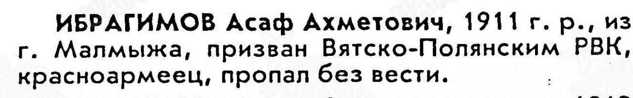 | 4317155015 | ИБРАГИМОВ Асаф Ахметович | 1911 г. р., из г. Малмыжа, призван Вятско-Полянским РВК, красноармеец, пропал без вести. | Кировская область, Малмыжский район |