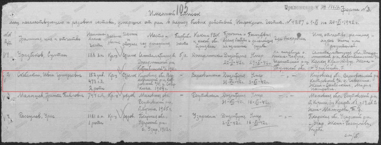 | Последнее место службы | 1942 | Орловская обл., 61 А 473 сп 152д 2р | красноармеец, стрелок |