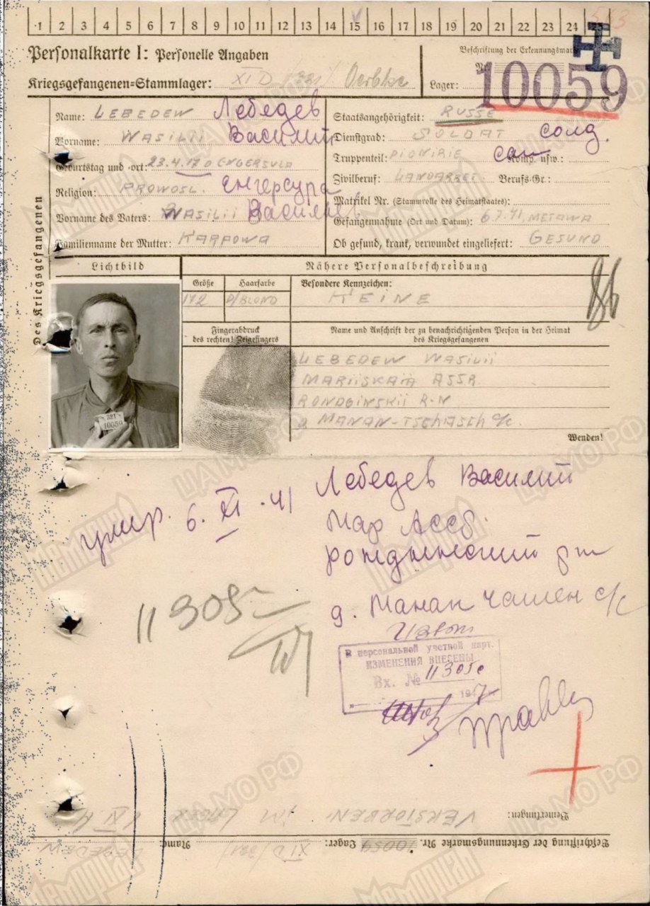 | Умер | 06.11.1941 | Stalag XI D (321) Oerbke (Эрбке, Германия) | Умер в немецком плену, в ревире лагеря военнопленных Эрбке. |