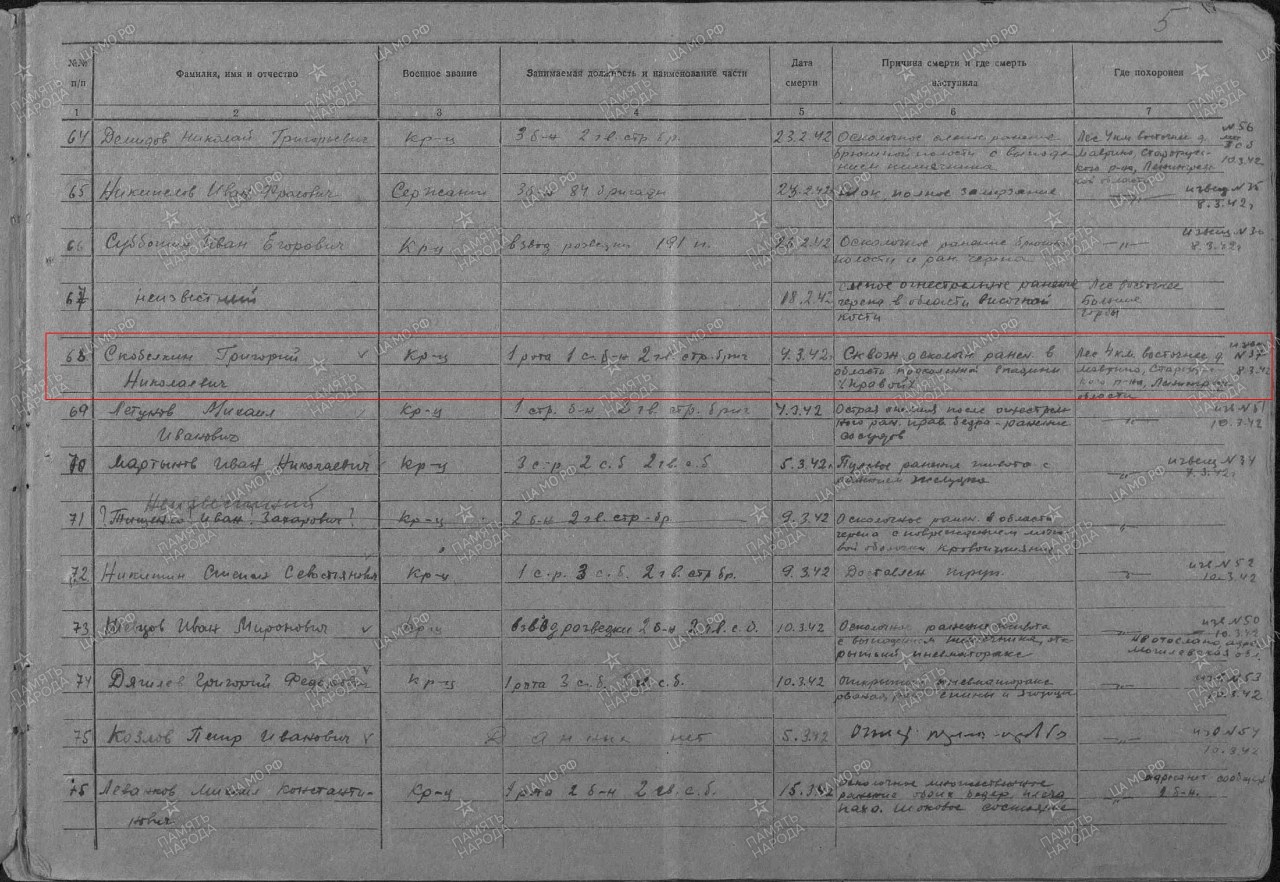 | Умер | 04.03.1942 | полевой госпиталь 31 ОМСБ | умер от кровопотери |