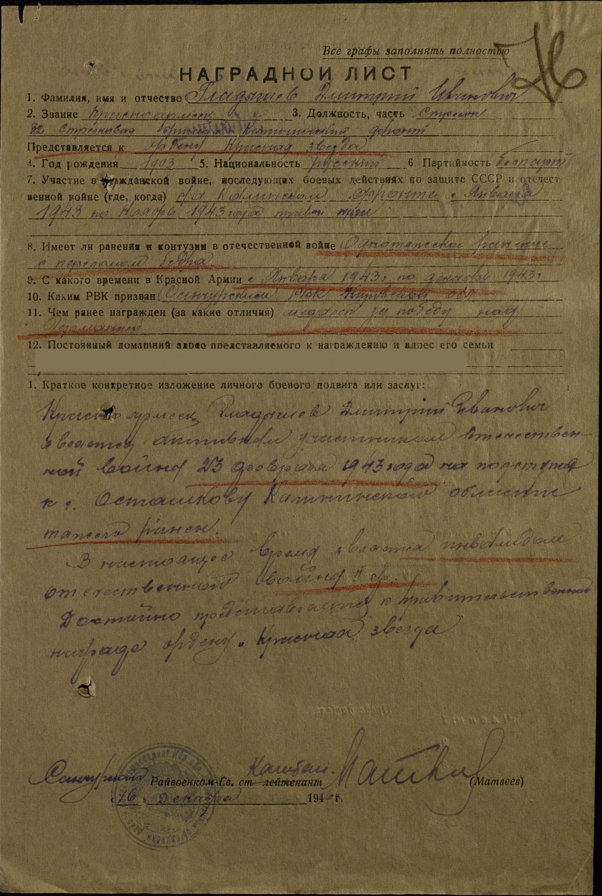 | Призван | Январь 1943 | пгт Санчурск (Царевосанчурск) (Санчурский район, Кировская область) - существующий н.п. | Место призыва: Санчурский РВК, Кировской области, Санчурского района |