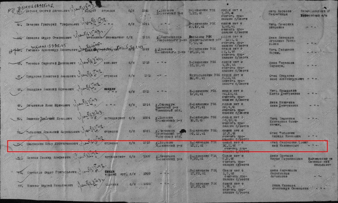 Тюмен.обл., пропал без вести в апреле 1942 г.