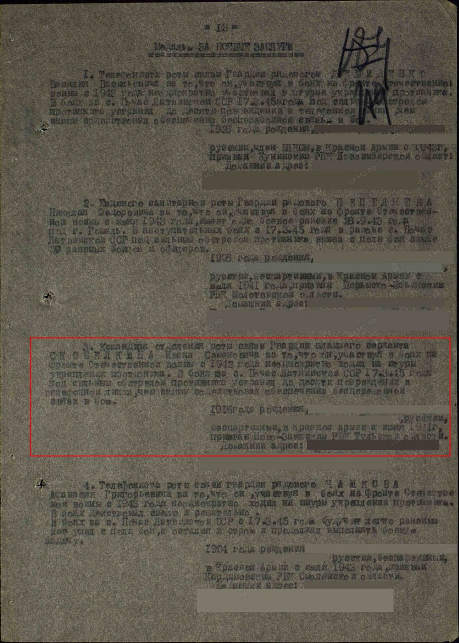 | Награждён: Медаль «За победу над Германией» | 16.11.1945 | 90 гв. сп 29 гв. сд | гв. мл. сержант, ком. отделения |