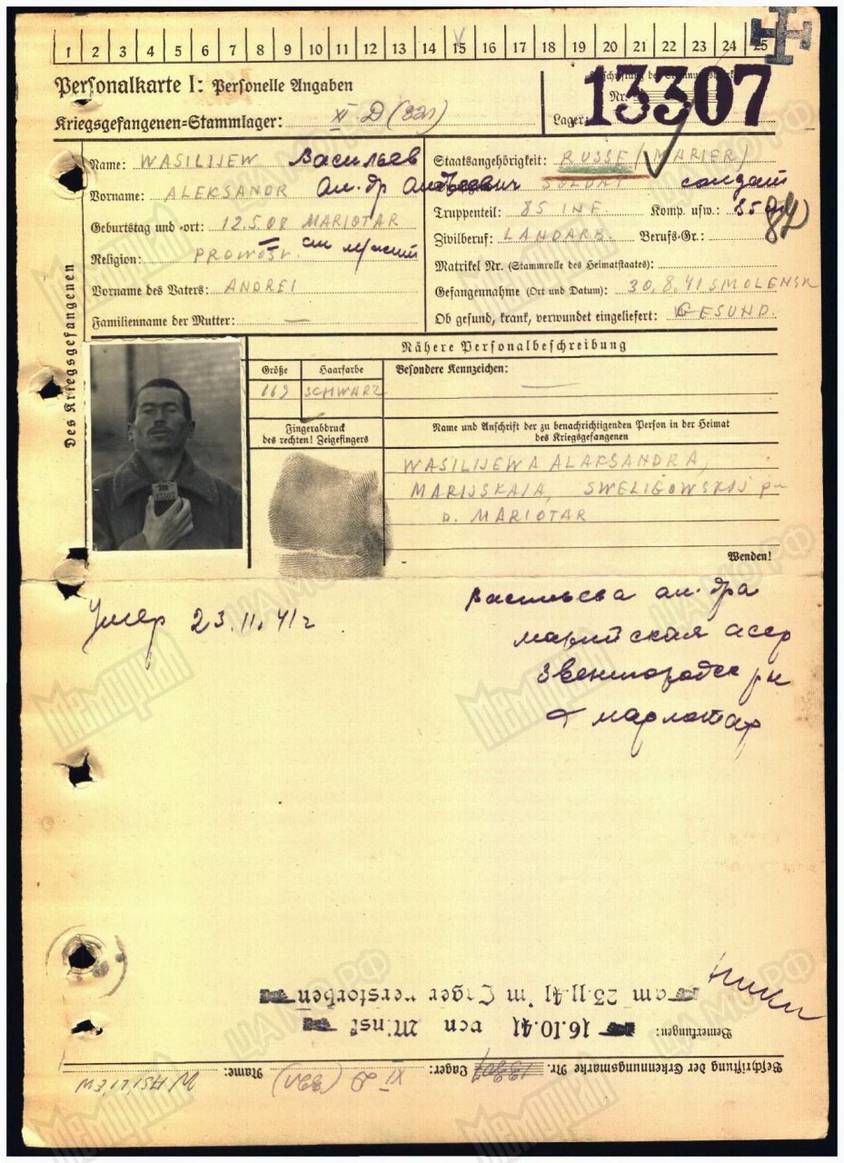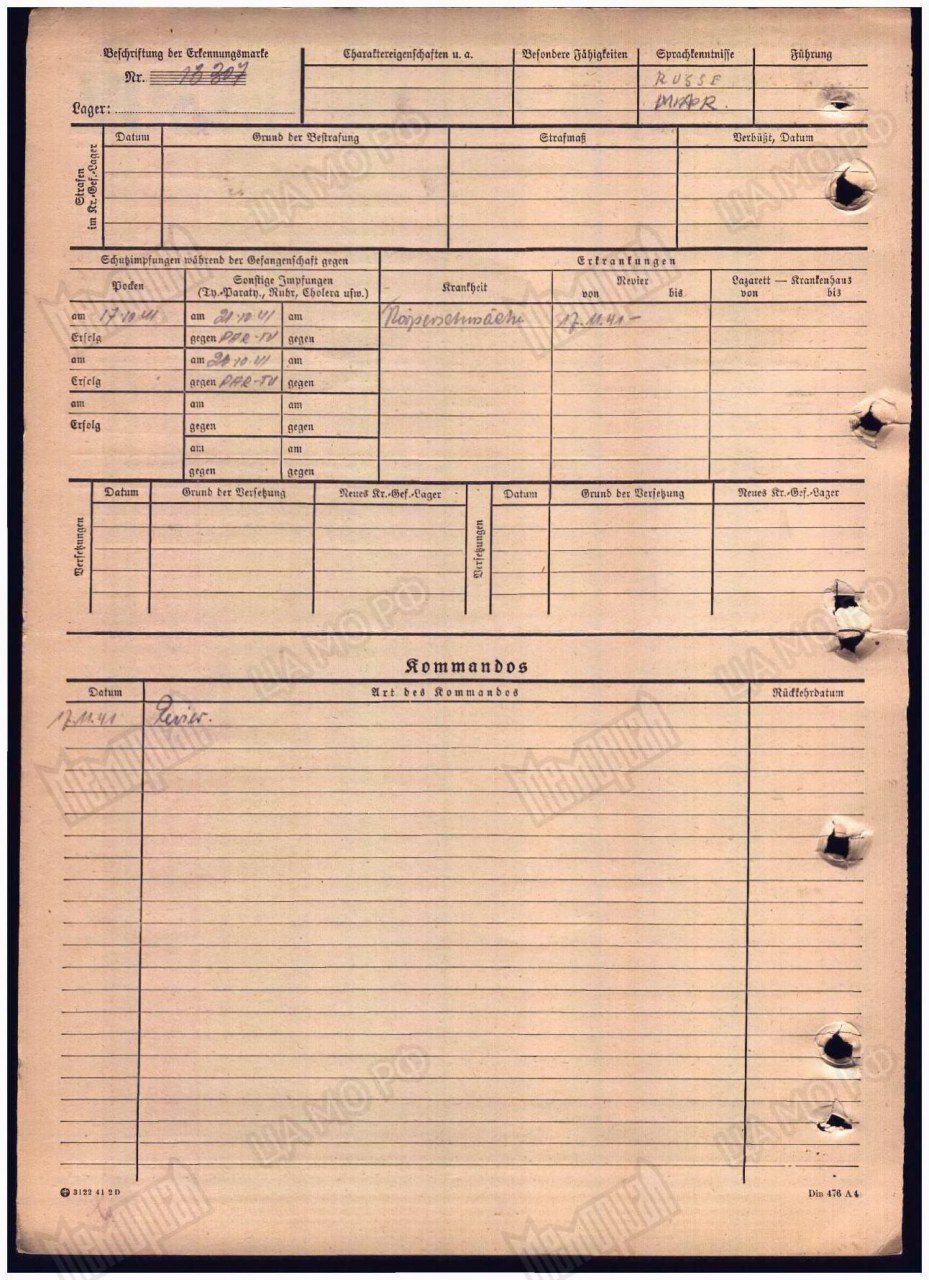 | Умер | 23.11.1941 | Stalag XI D (321) Oerbke (Эрбке, Германия) | Умер в немецком плену, в лагере военнопленных Эрбке. |