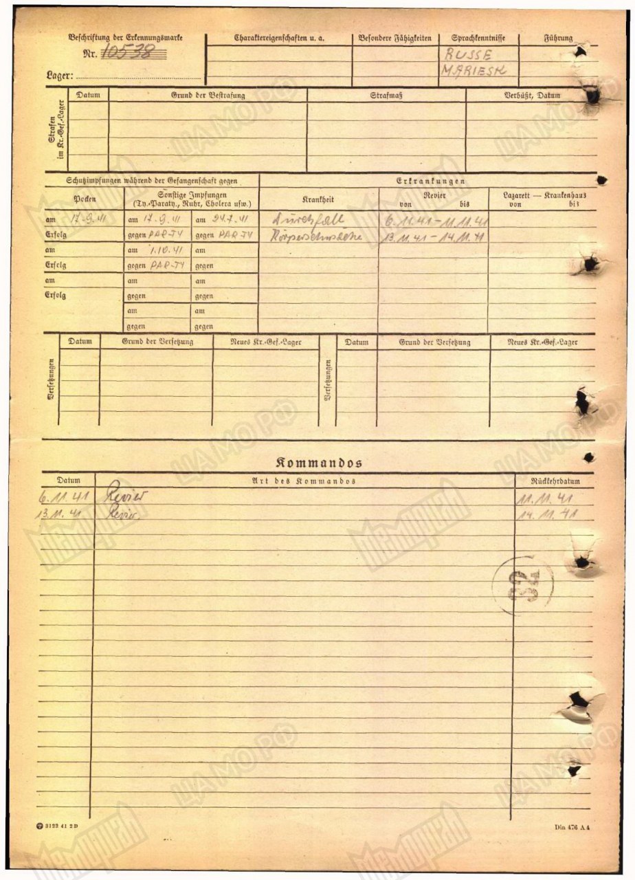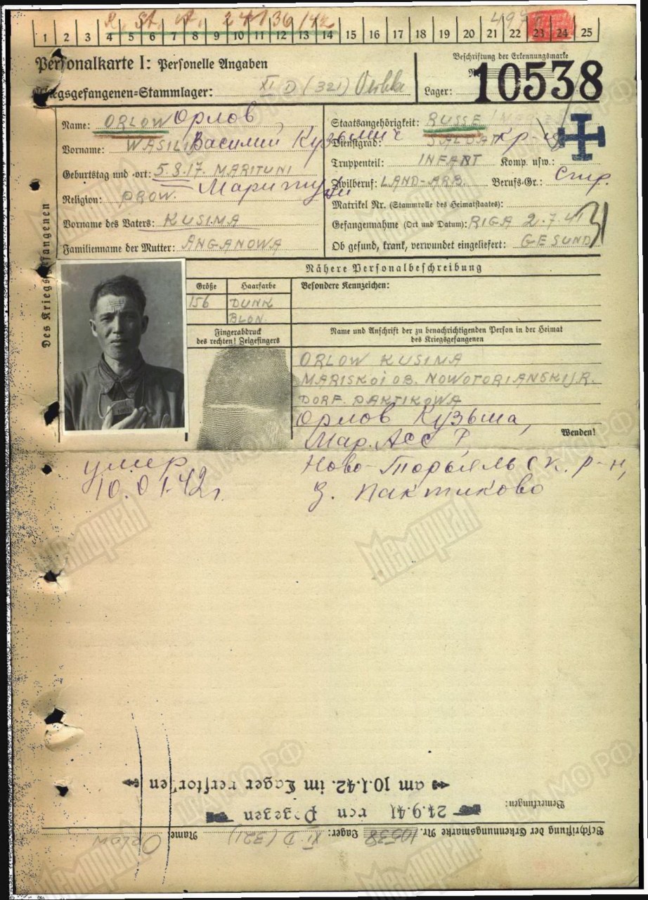 | Умер | 10.01.1942 | Stalag XI D (321) Oerbke (Эрбке, Германия) | Умер в немецком плену, в лагере военнопленных Эрбке. |