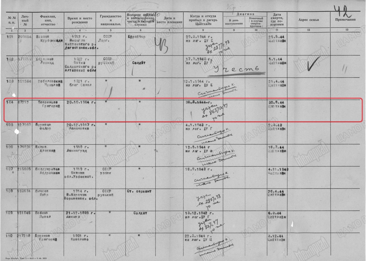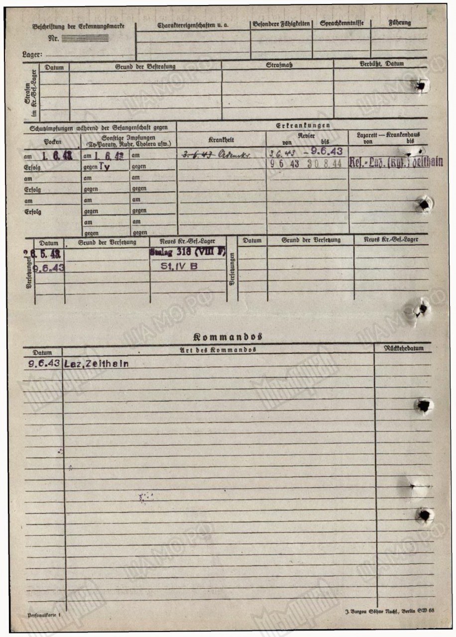 | Умер | 30.08.1944 | Kgf. Res. Lazarett Zeithain (Цайтхайн, Германия) | Умер в немецком плену, в лазарете Цайтхайн. |