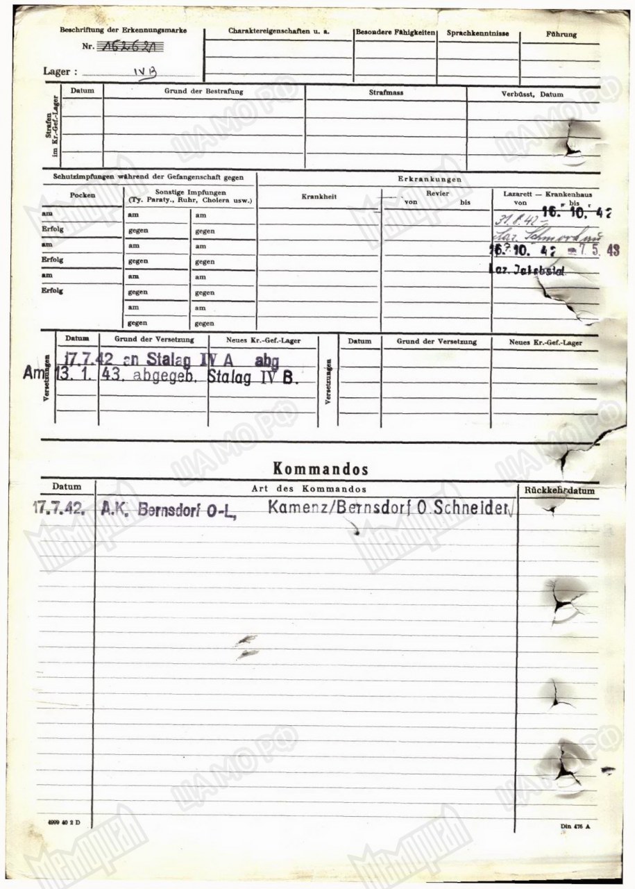 | Умер | 07.05.1943 | Lazarett Jakobstal или Kgf. Res. Lazarett Zeithain (Цайтхайн, Германия) | Умер в немецком плену, в лазарете Якобсталь или Цайтхайн. |
