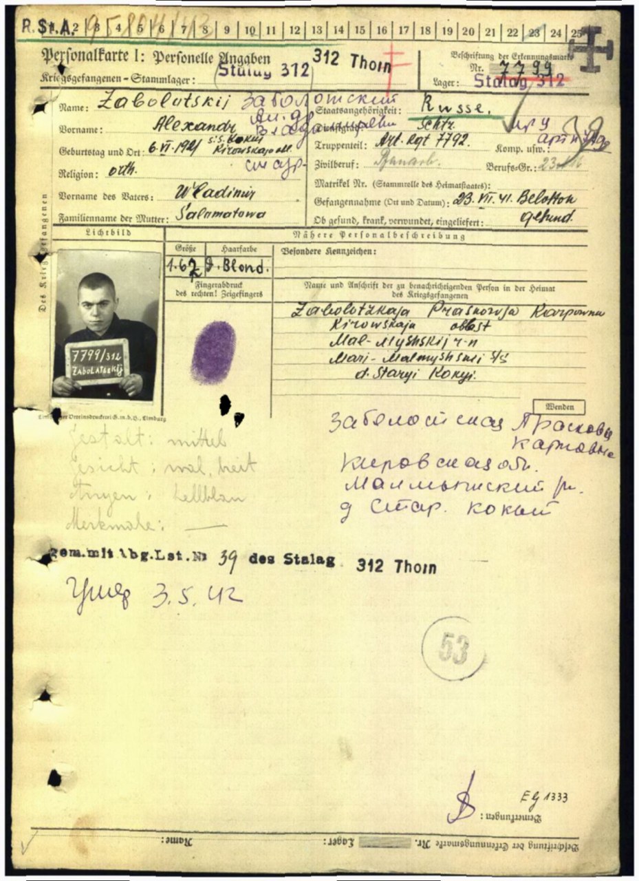 В послевоенном опросе мать - Заболотских Парасковья Карповна - заявила о пропаже сына - Заболотских Александра Владимировича.