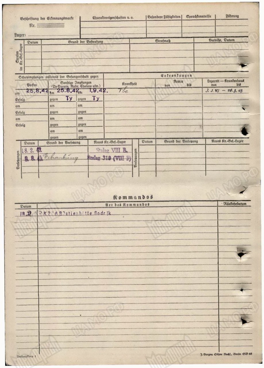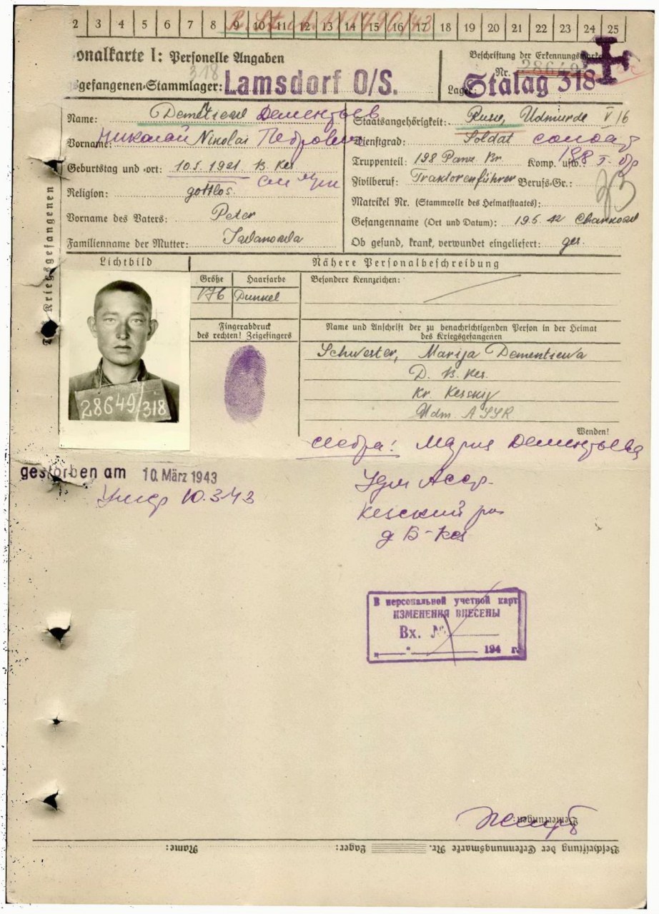 | Умер | 10.03.1943 | Stalag 318 Lamsdorf (Ламбиновице, Польша) | Умер в немецком плену, в лазарете лагеря военнопленных Ламсдорф. |