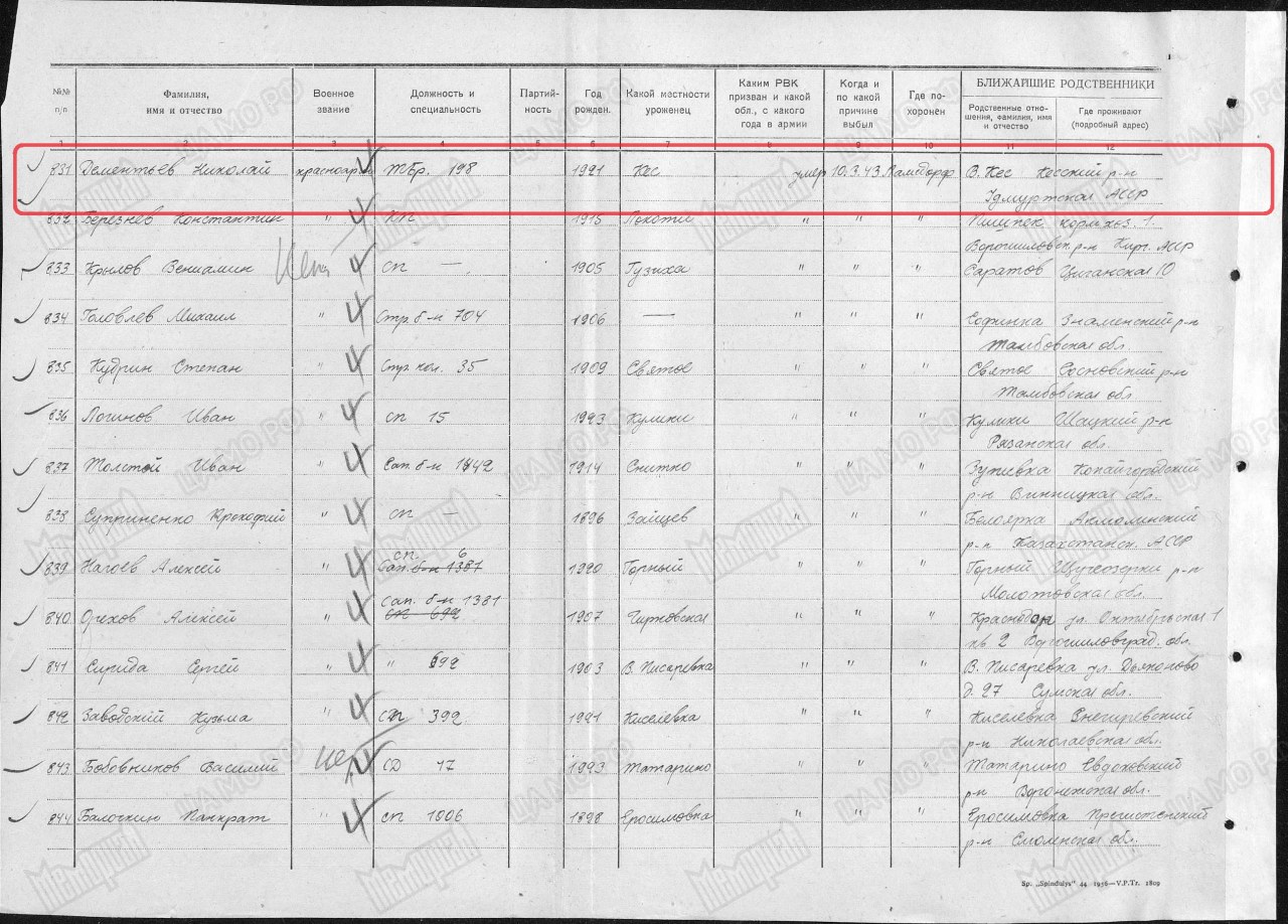 | 1805219007 | ДЕМЕНТЬЕВ Николай Петрович | род. 1923, д. Бол. Кез. Призван в Сов. Армию Кезским РВК 14 дек. 1940. Рядовой. Погиб в бою 23 июля 1944. Похоронен: д. Орехова Гора Ленинградской обл. | Удмуртская Республика, Кезский район |