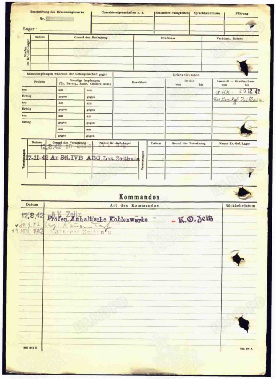 | Умер | 26.12.1942 | Kgf. Res. Lazarett Zeithain (Цайтхайн, Германия) | Умер в немецком плену, в лазарете Цайтхайн. |