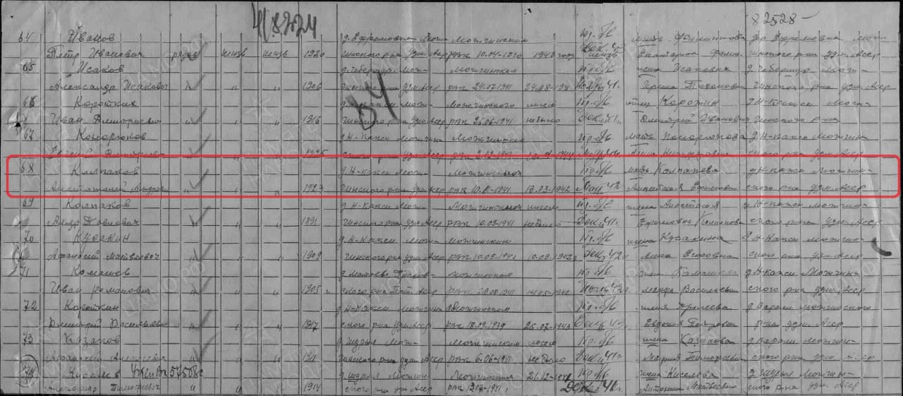 | 1801394023 | Колпаков Анатолий Александрович | род. 1923, д. Новые Какси. Призван в Сов. Армию в 1941. Рядовой. Пропал без вести, май 1942. | Удмуртская Республика, Можгинский район | |||