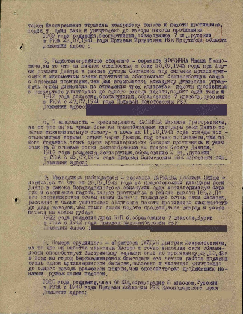 | участие в Великой Отечетвенной войне | 26.07.1941 - 25.02.1944 | Воинское звание красноармеец ; рядовой Воинская часть 1110 пушечный артиллерийский полк 2 Украинский фронт | |